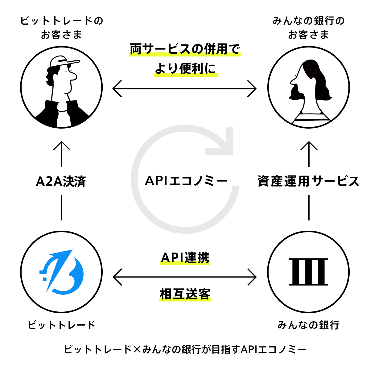 今般の基本合意は、ビットトレードが提供する暗号資産口座への入金手段の1つとしてみんなの銀行が提供する更新系API(口座振替API)と接続することで、投資資金の移動に伴う付加価値向上に向けた検討を行うものです。