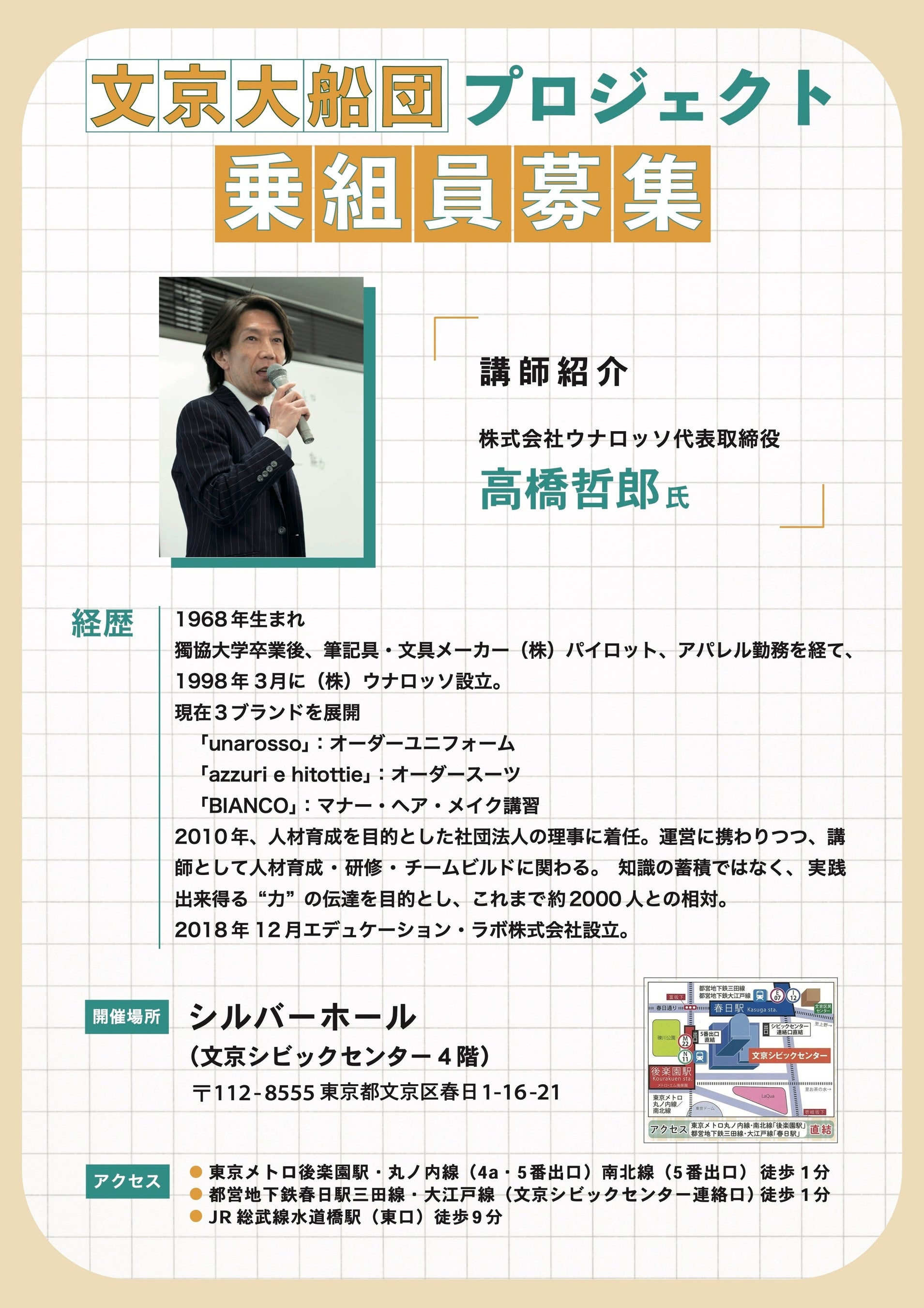 人材育成やチームビルドの研修を行っている高橋哲郎氏を講師に迎え、人を巻き込む手法を学びます。