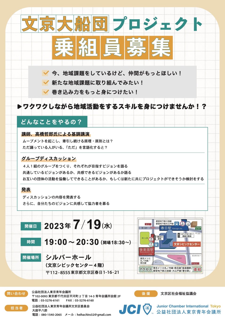 7月19日(水)19:00〜開催!【巻き込み力をつけて、地域活動に活かそう!文京大船団プロジェクト】#後楽園駅 直結、文京シビックセンター・参加費無料