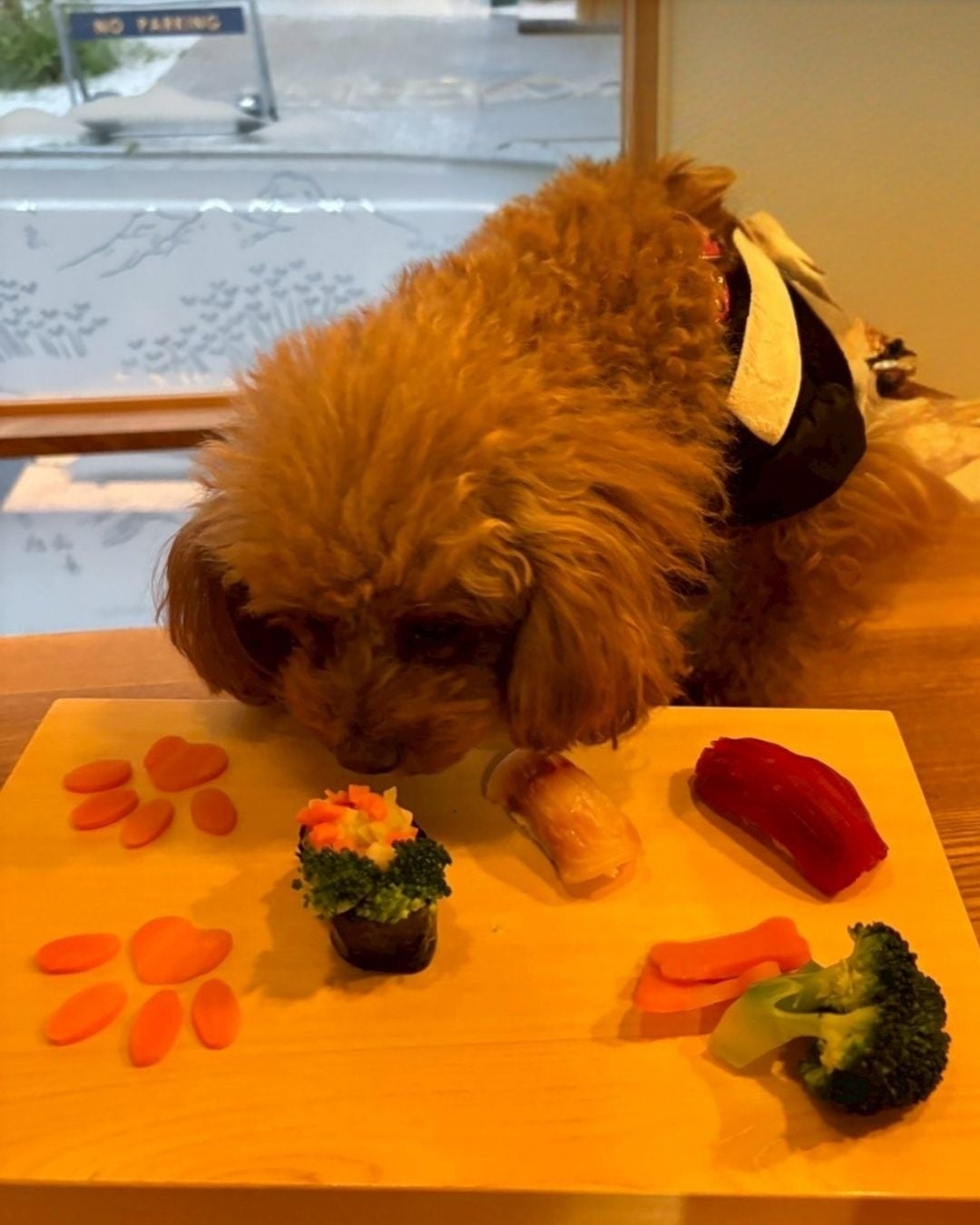 ネタは、鮮度にこだわった良質な鮮魚を使用。生でも安心してお召し上がりいただけますが、ご希望に応じてボイルをすることも可能です。シャリ部分は、マッシュポテトと鶏むね肉をやさしく混ぜ合わせて再現。見た目は人間用の鮨そのもの。思わず写真を撮りたくなる “映え鮨” に仕上げました。軍艦には、ブロッコリー・にんじん・マッシュポテトなどを彩り豊かにトッピング。味付けは一切せず、わんちゃんの健康に配慮し、素材本来の風味を大切にしています。内容量は、小型犬1匹にちょうどいいサイズ感。ご提供開始直後から、飼い主さまはもちろん、わんちゃんたちからも “おいしい” リアクションを多数いただいています。
