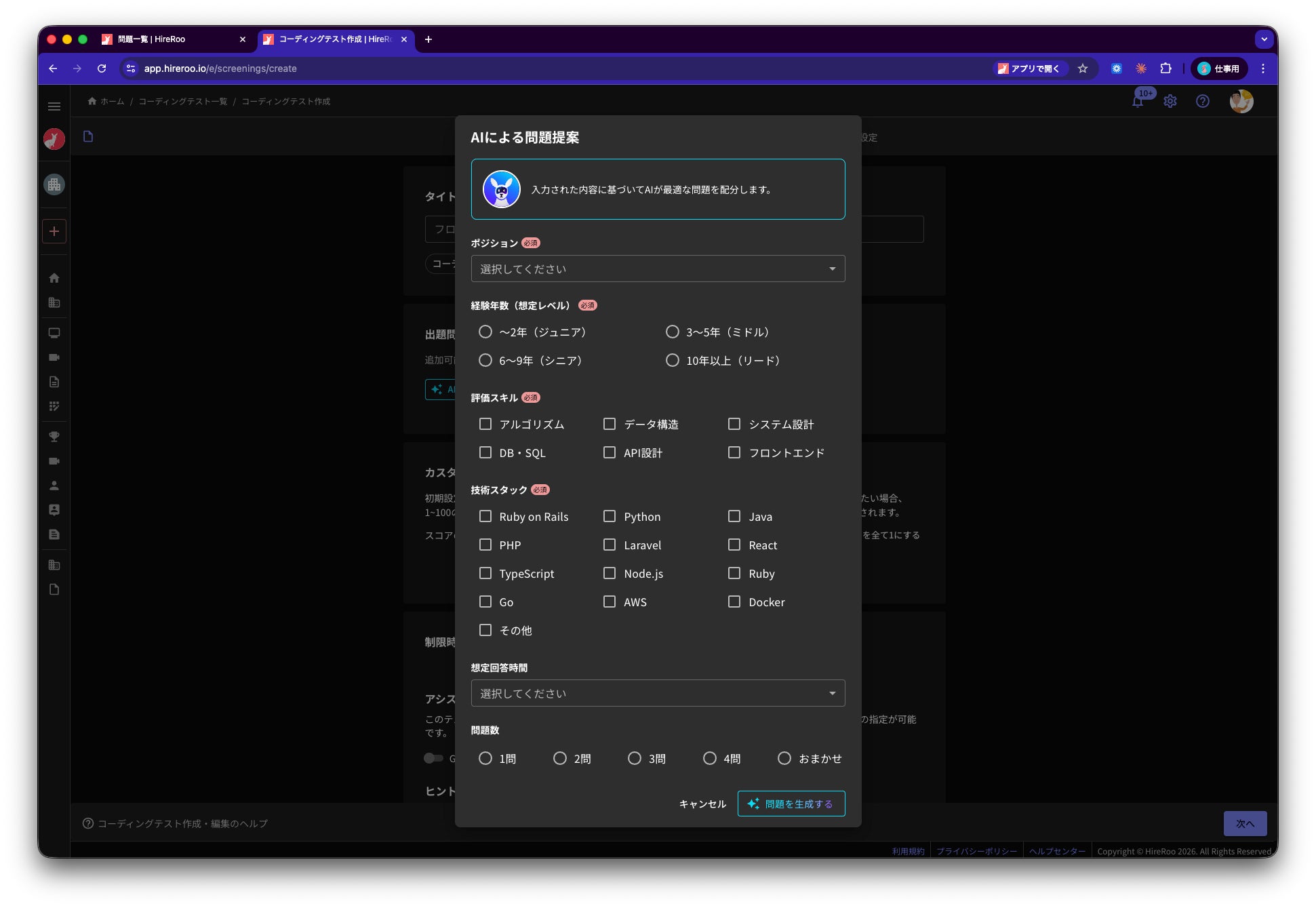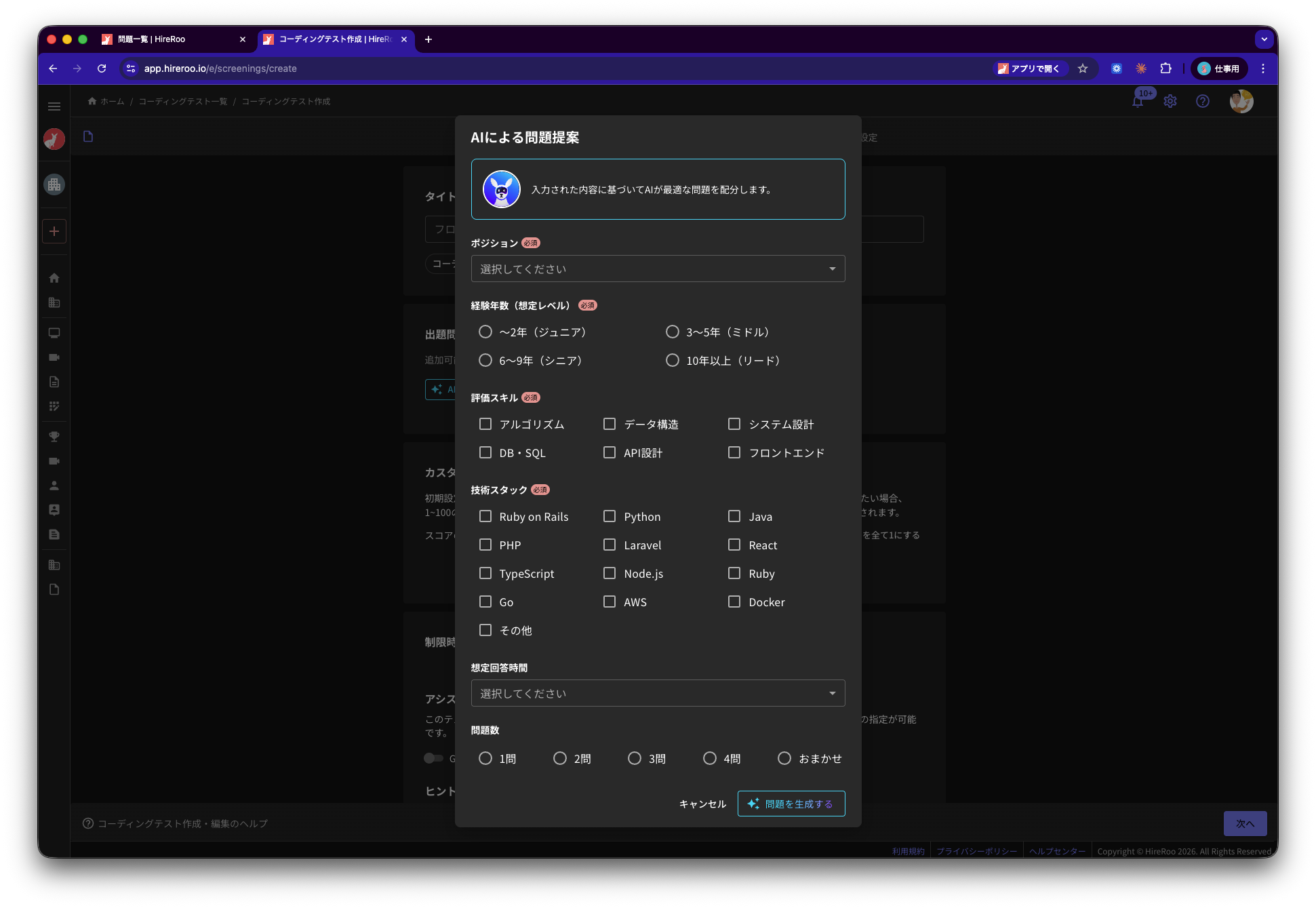 株式会社ハイヤールー(本社:東京都渋谷区、代表取締役:葛岡宏祐)は、ビッグテック企業水準の採用選考を、誰でも簡単に導入できる「Skill Interview」に、AI問題選定機能をリリースしました。この機能は、「Skill Interview」にある約300問のスキルテストから、評価したいスキルや人材像を自然言語で入力することで、目的に合致した最適な問題セットを提案します。