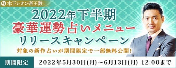 テレシスネットワーク株式会社(本社:東京都港区、代表取締役:鷹石惠充 https://www.telsys.co.jp/)は、2022年5月30日(月)より、月額公式サイト『木下レオン◆帝王数』にて、『木下レオン帝王数 2022年下半期 豪華運勢占いメニュー リリースキャンペーン』を公開いたします。