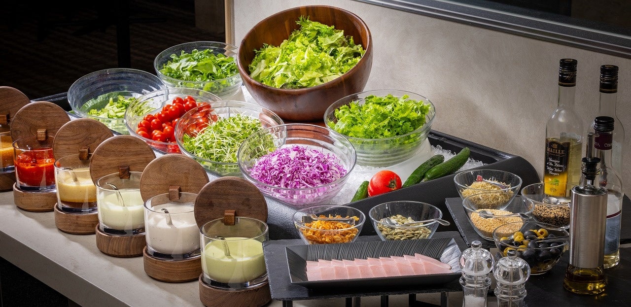 レタスやわさび菜、ほうれん草、ルッコラ、スプラウトなど、静岡県産の野菜を中心に揃えたサラダコーナー。オリーブ、パンプキンシード、キヌア、ジャコ、フライドオニオン、ハムなど、食感や彩りをプラスする多彩なトッピングで、自分だけのオリジナルサラダをお楽しみいただけます。ドレッシングは5種類ご用意しており、なかでも静岡県産葉生姜を使用した爽やかなドレッシング、トマトの甘みを活かしたトマトドレッシング、ツンとした風味がアクセントのクリーミーなわさびドレッシングなど、野菜のおいしさを引き立てるこだわりの味わいで、お好みの一皿に仕上げていただけます。