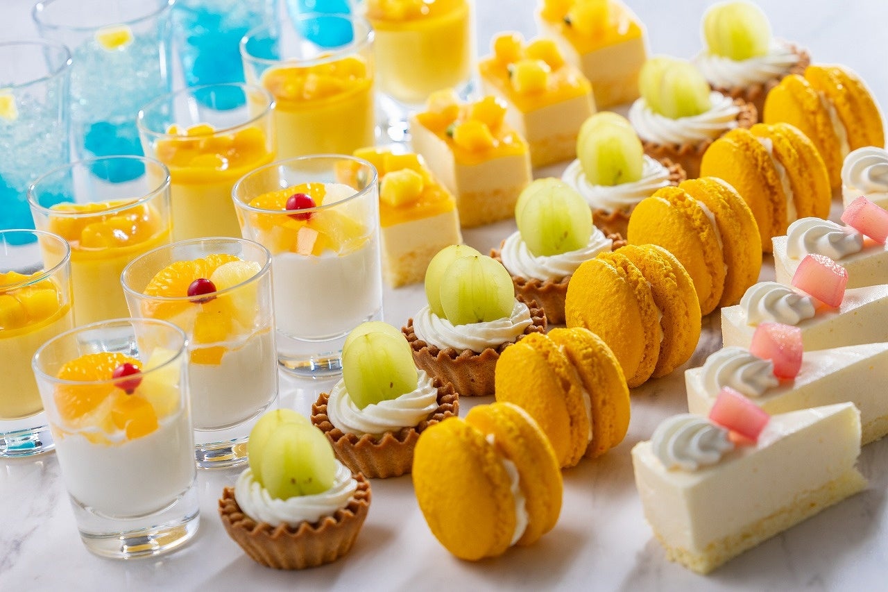通常期間のブッフェに加え、約15種類の夏スイーツが一度に楽しめる贅沢な企画です。夏にぴったりのマンゴープリンやパイン&マンゴーのケーキ、ピーチ&レモンのムース、マスカットジャムや静岡みかんジャムを使用したマカロンのほか、海をイメージしたライムゼリーや、宝石のようにキラキラと輝く琥珀糖など、パティシエが一つひとつ丁寧に仕上げた、見た目にも華やかなスイーツが勢揃いします!