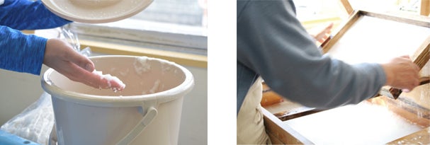 絵はがきは、「NPO法人まつぼっくり障がい者就労支援事業所わーくるほーぷ」の皆さんが制作しています。絵の制作はもちろん、紙づくりから印刷、裁断、封入に至るまで、ひとつひとつ丹精込めて作られています。絵はがきの紙は使用済み牛乳パックを再利用し、丁寧に1枚1枚紙すきで仕上げています。