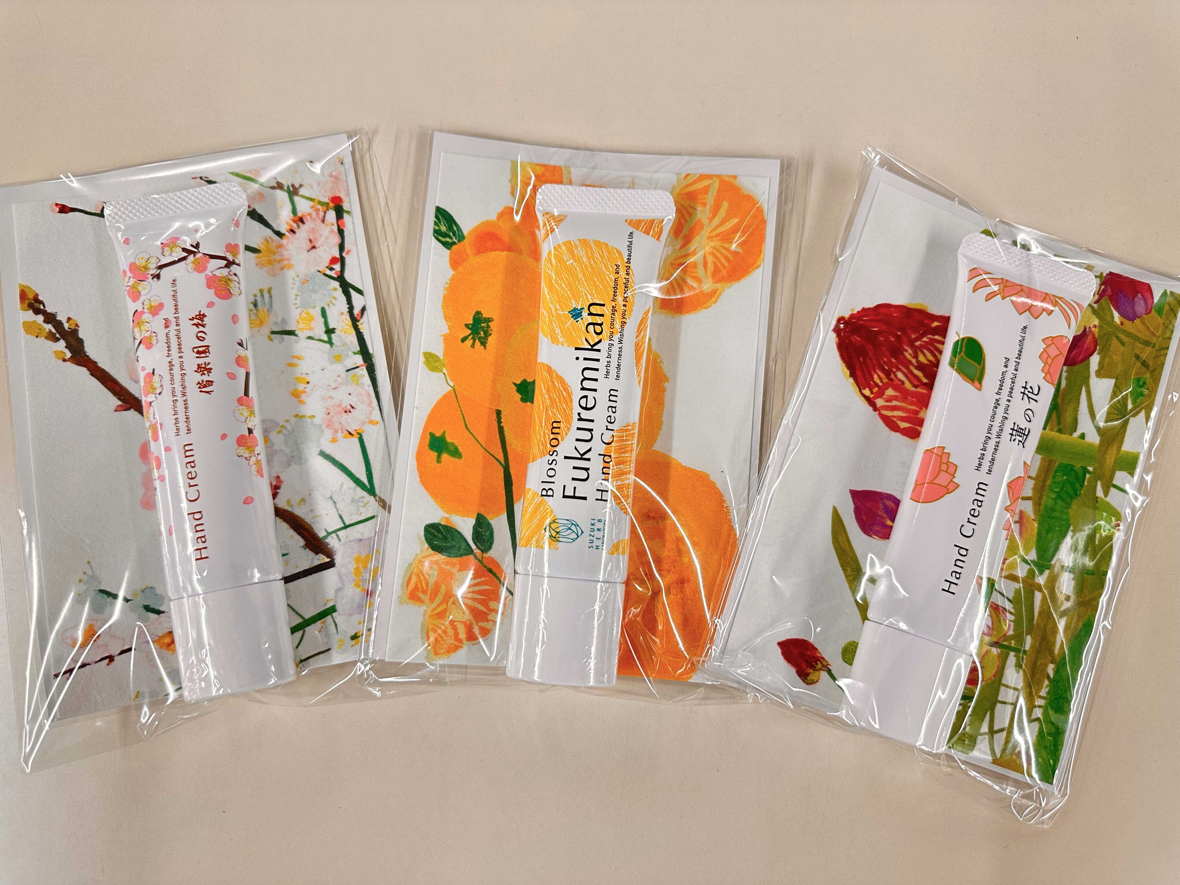 茨城県特産品の“福来みかん”の香りを再現した「福来みかんハンドクリーム」は県内432局(一部郵便局を除く)、日本三大名園の一つである偕楽園の梅の花“白加賀”の香りを再現した「偕楽園の梅ハンドクリーム」は県央地区の92局、日本一のレンコンの産地である土浦市の蓮の花エキス*1を使用した「蓮の花ハンドクリーム」は県央地区92局、県南地域の102局でお取り扱いとなります。