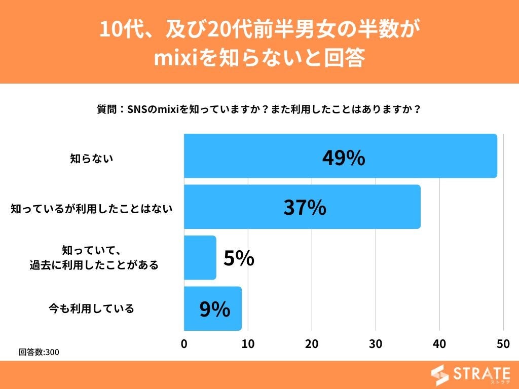 10代~20代前半の男女を対象とした「SNSのmixiを知っていますか?また利用したことはありますか?」というアンケートで最も多かった回答は「知らない」で49%でした。