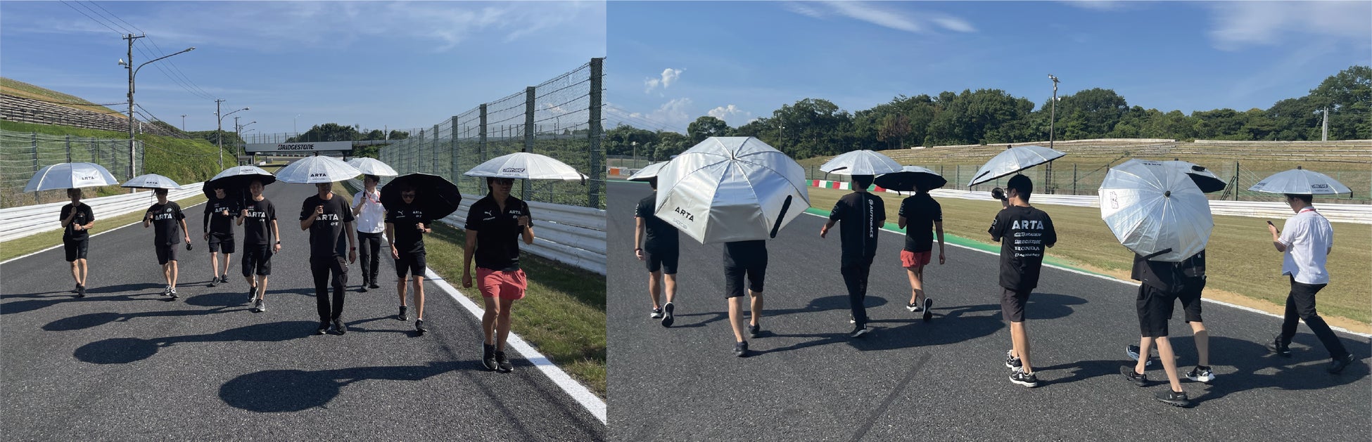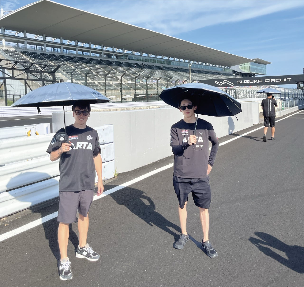 近年の夏場の急激な気温上昇により、レースの運営は過酷さを極めています。特に今年は5月から猛暑日の中でのレース展開となり、路面温度は60℃近くにも達しています。ドライバー、メカニックは太陽光の直射のみならず、路面からの強い輻射熱にさらされる事になり、熱中症リスクが極めて高い環境下で長時間過ごさざるを得ない状況です。そのような過酷な状況を少しでも緩和することを目的にARTAでは、2025年8月22日から24日まで開催された「SUPER GT 第5戦 鈴鹿大会」で、優れた冷却性能を持つSPACECOOL素材を活用した日傘を導入することに至りました。