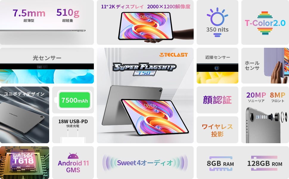 20MPオートフォーカスSonyカメラを使用して人生の瞬間を捉えます。 それはさらに良いショットのために画質を大幅に向上させます。 4色補正付きの8MPフロントカメラは、自分撮りやビデオ通話でより鮮明な画像を提供します。最もスマートなタブレット体験を提供するインテリジェントセンサーが搭載されています。 光センサーは画面の明るさを調整でき、近接センサーはポップアップ通知までのユーザー距離を検出できます。