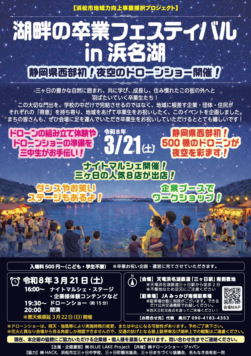 株式会社ドローンショー・ジャパン(本社:石川県金沢市、代表取締役:山本 雄貴)は、2026年3月21日(土)に天竜浜名鉄道「三ヶ日駅」前で開催される「湖畔の卒業フェスティバル in 浜名湖(主催:株式会社BLUE LAKE Project、以下「本イベント」)」に共催として参画いたします。