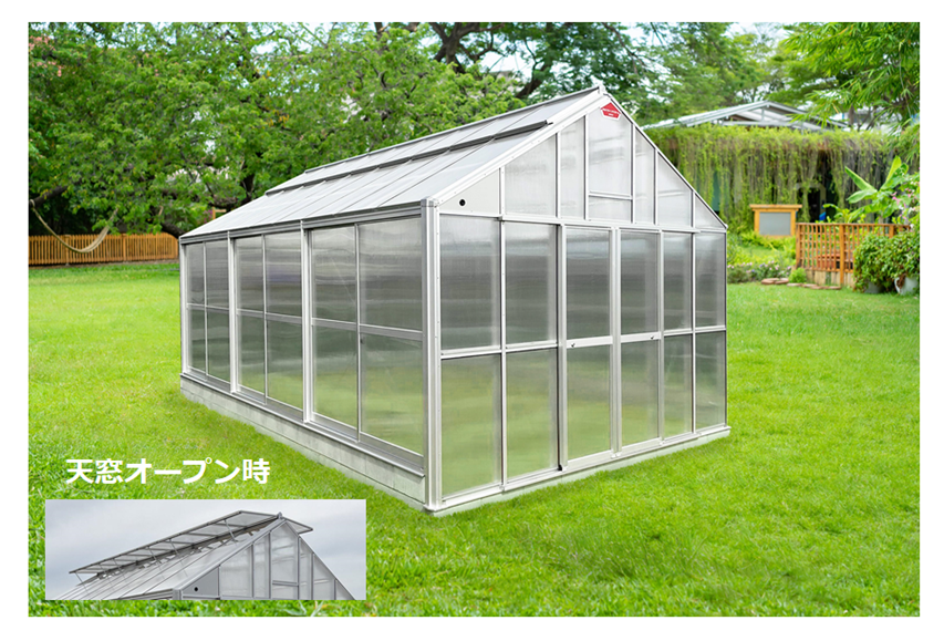 アルミ製温室 「マイルームS アルナグリーン」は、両天窓を開閉できるタイプ(手動式)のため風通しが良く、また、間口3.6m、奥行5.9m、高さ約3.2mのゆとりのあるサイズで、広く快適な空間の中でたくさんの植物を育てることができます。