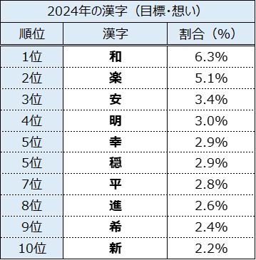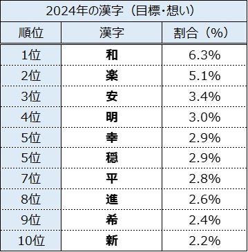 『2024年への目標や想いを表す漢字』は、1位は「和」(応募総数における割合:6.3%)、2位は「楽」(5.1%)、3位以下は「安」(3.4%)、「明」(3.0%)、「幸」(2.9%)という結果になり、3位以下を上位2つの漢字が票数を引き離す結果となりました。【表2】