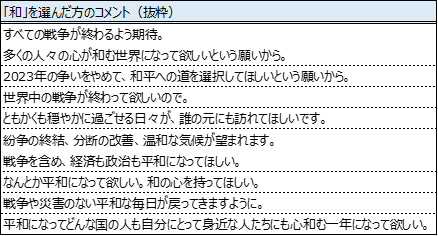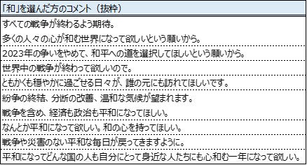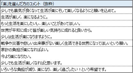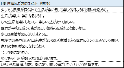 2024年の漢字で、3位以下の漢字を引き離した、1位「和」・2位「楽」を選ばれた方のコメントをご紹介します。「和」を選ばれた理由として、ロシア・ウクライナ戦争やパレスチナ・ガザ戦争などの世界情勢に対する不安感から、平和を願う意味を込めて「和」を選ばれていることが伺えます。【表3】また、「楽」については、戦争に対する平和を願う気持ちから、近年の日本経済への不安や家計負担増の状況も含めて、今よりも「らく」に「たのしい」1年になって欲しいと未来への期待を込めて「楽」を選ばれていることが伺えます。【表4】