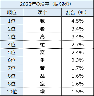 『2023年を表す漢字』は、1位は「戦」(応募総数における割合:4.5%)、2位は同率で「暑」「高」(3.4%)の2つとなりました。【表1】