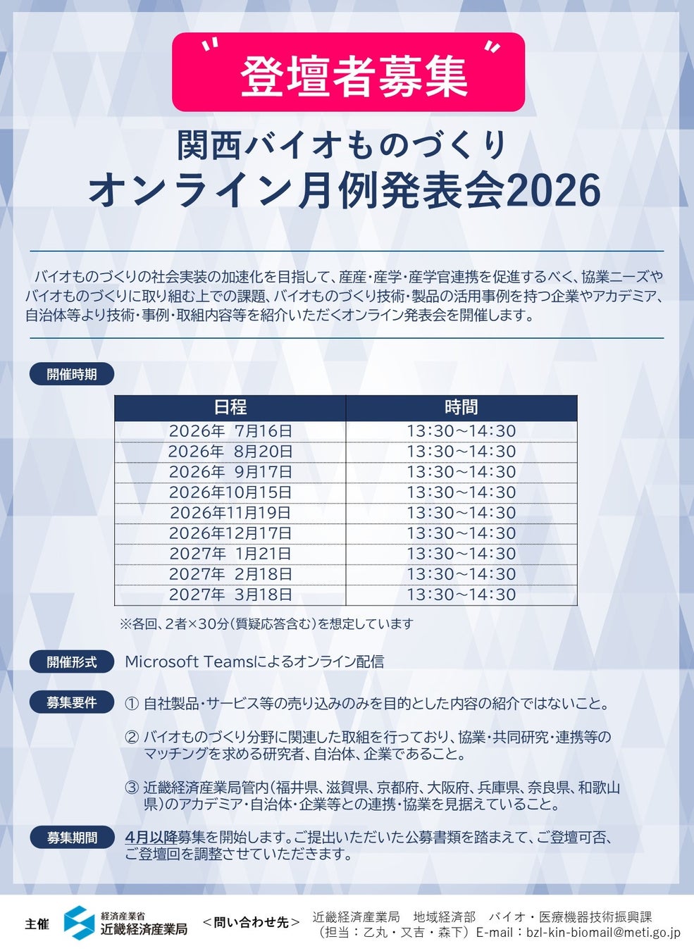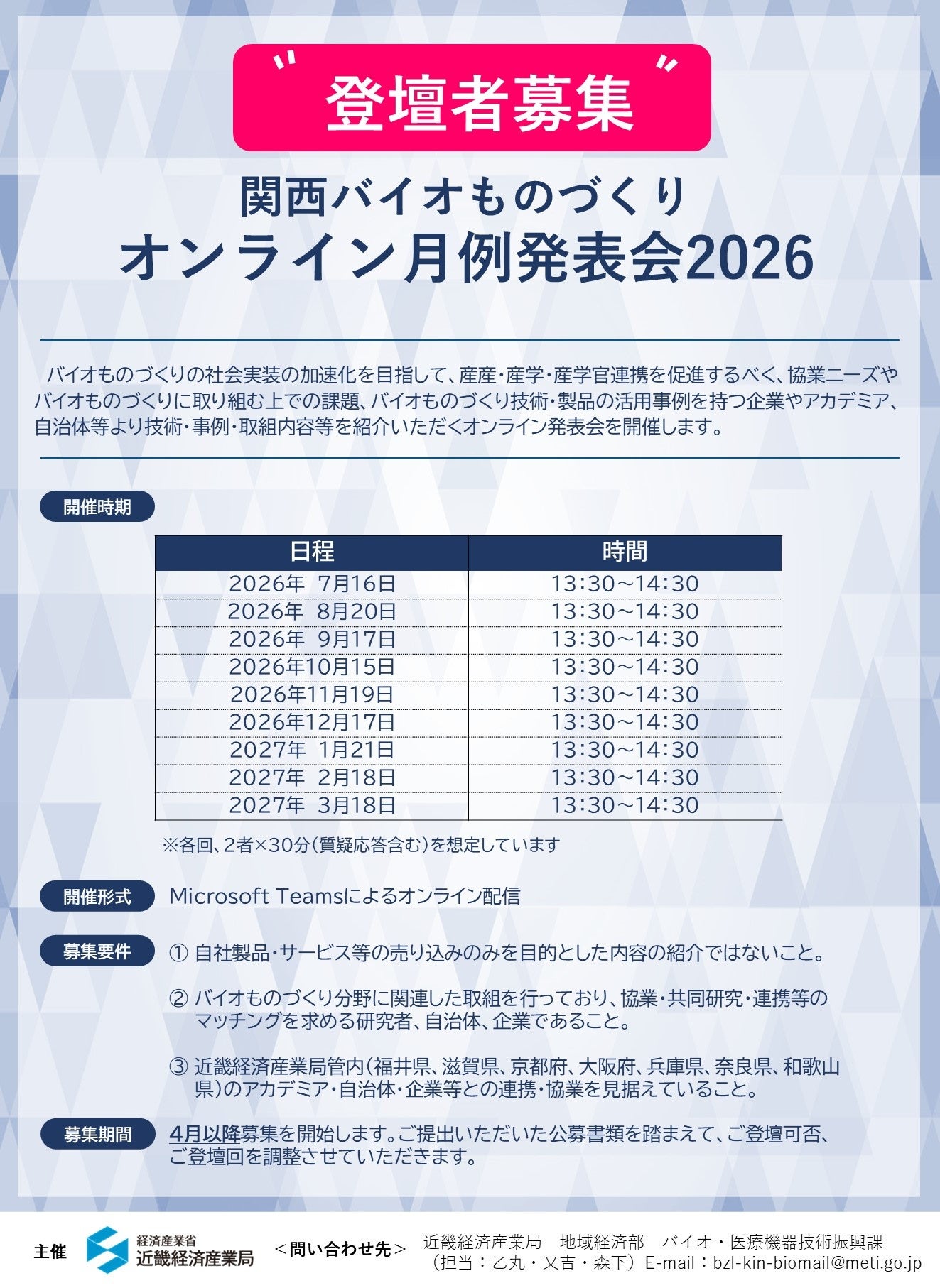 経済産業省近畿経済産業局では、「関西バイオものづくりオンライン月例発表会」を5月27日(水)から毎月開催します。本発表会は、バイオものづくり分野に取り組む大学・研究機関や企業、自治体等に毎月ご登壇いただき、研究内容の紹介と意見交換を行うことで、バイオものづくり分野の研究内容への理解を深めていただき、産学連携・産産連携の促進を図ることを目的としています。
