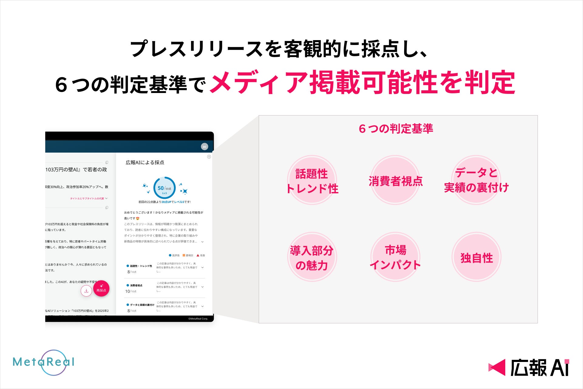『広報AI』はメディアの取材傾向データや100名以上の広報担当者の知見をもとに、当社が開発した“独自のメディア掲載判定ロジック”(※3)を用いた採点機能を搭載しています。この判定ロジックでは、1)話題性、2)消費者視点、3)データと実績の裏付け、4)導入部分の魅力、5)市場インパクト、6)独自性の6つの基準からプレスリリースを客観的に採点し、掲載可能性を判定します。これにより、プレスリリースの改善点が一目で分かり、メディアに届くプレスリリース作成を支援します。