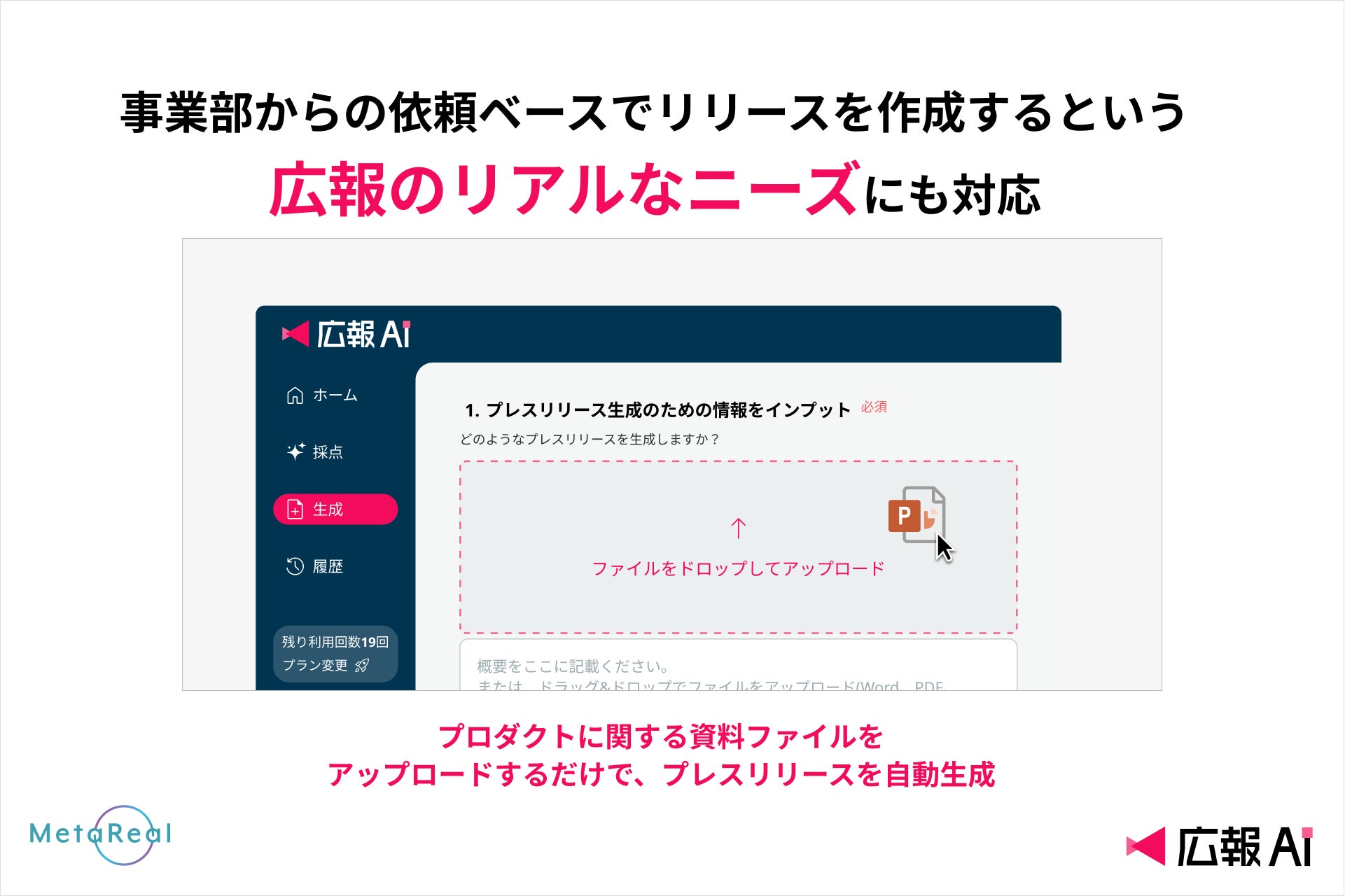 さらに、事業部からの依頼ベースでリリースを作成するという広報のリアルなニーズにも対応。プロダクトに関するPDFなどの資料をアップロードするだけで、リリースを自動生成します。これにより、作成スピードを大幅に向上させ、部署間のやりとりも円滑にします。