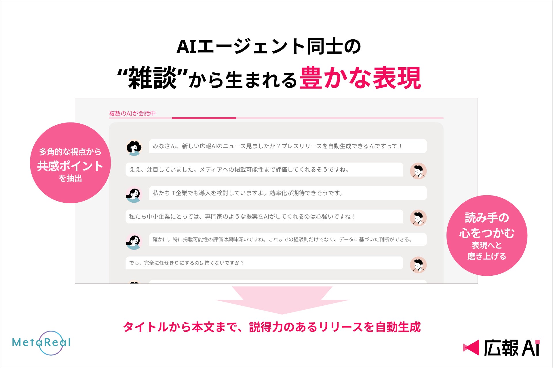 特徴② ほぼ人間並み?AIエージェント同士の雑談から生まれる豊かな表現 (プレスリリース生成機能)