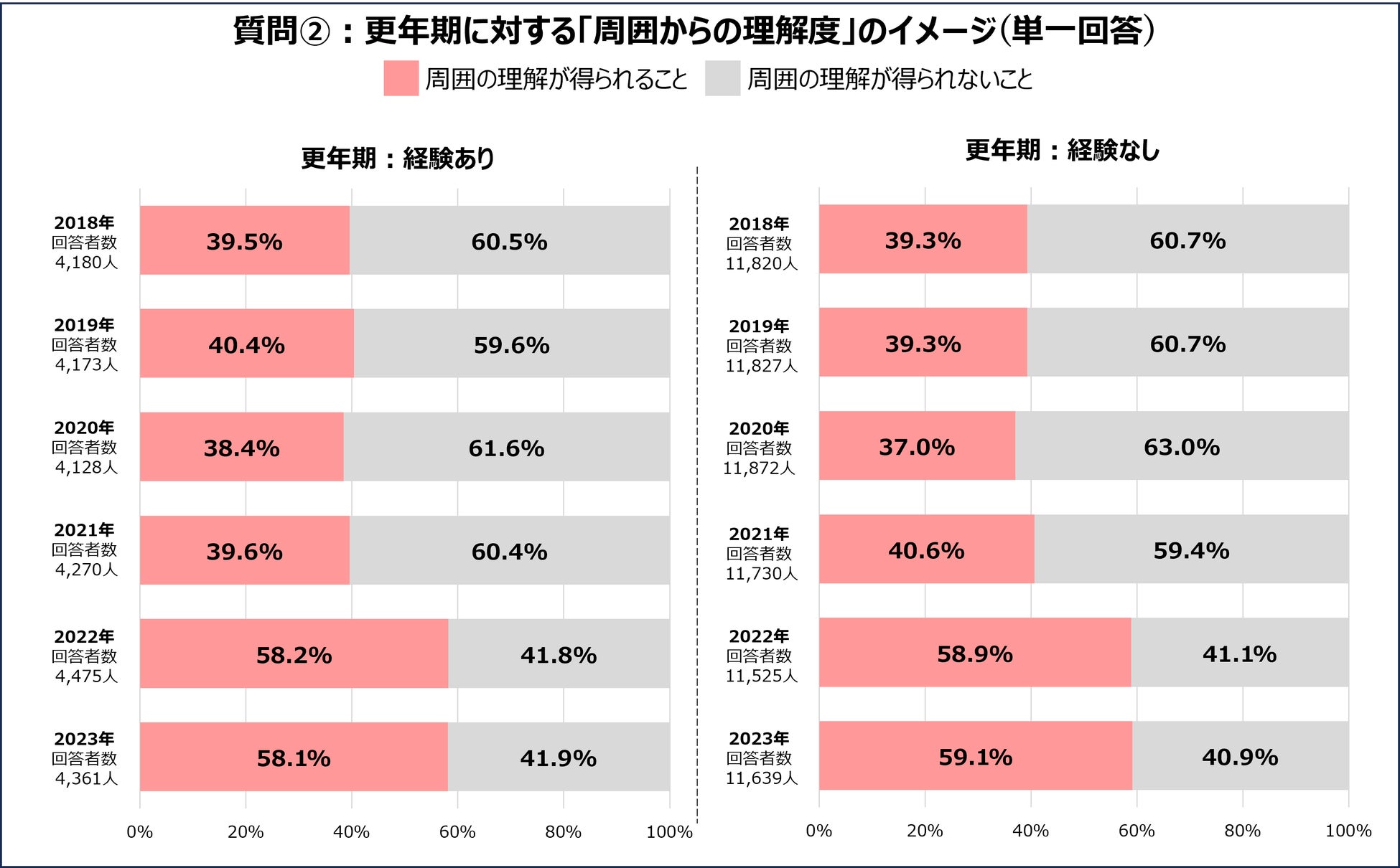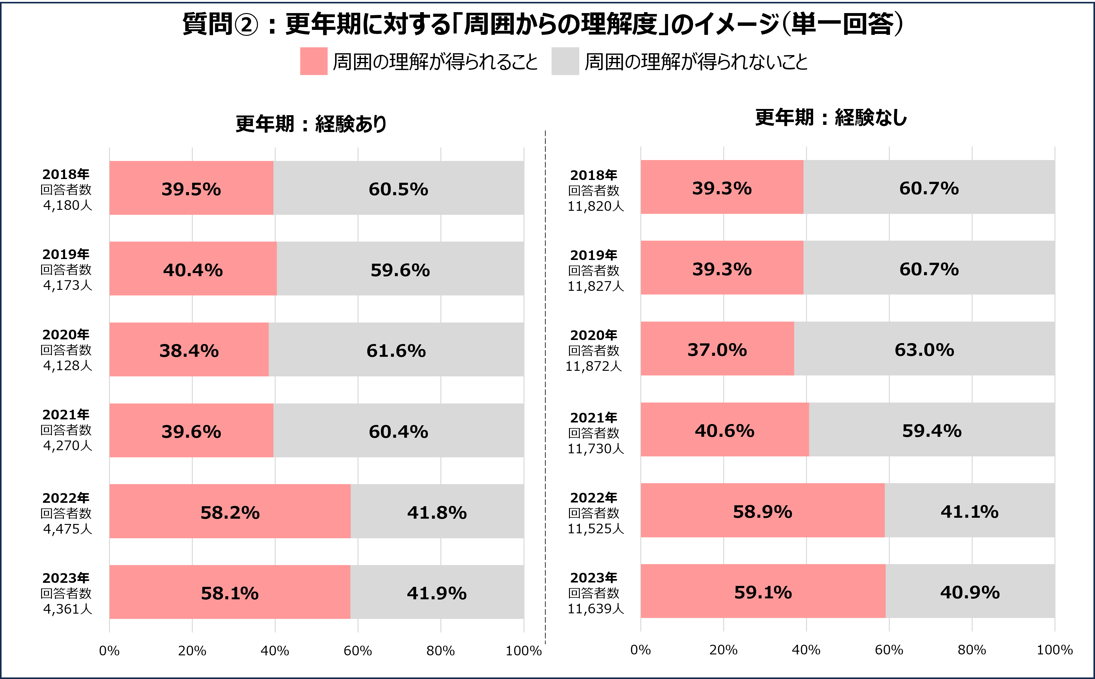 その中で質問①と同じく、2022年に傾向の変化があり、更年期の経験ありとなしの双方で更年期を「周囲の理解が得られること」と捉える方が18ポイント以上も増加し、多数派となりました。この傾向は2023年も続き、「周囲の理解が得られること」と回答した方の割合は、「更年期:経験あり」で58.1%、「更年期:経験なし」で59.1%となりました。