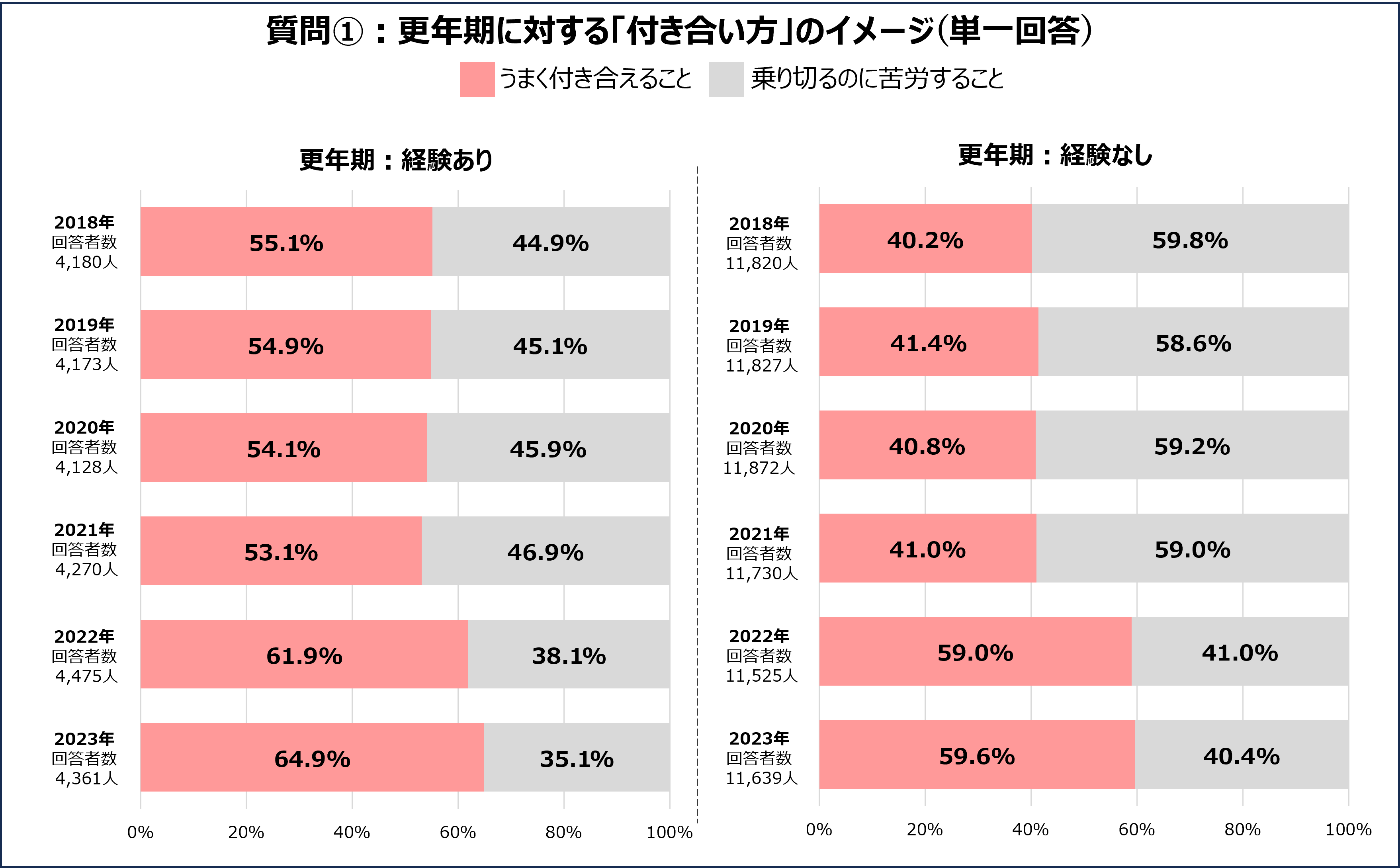 その中、2022年に傾向の変化がありました。「更年期:経験あり」で「うまく付き合えること」と回答した方の割合が前年の2021年から8.8ポイント増の61.9%、「更年期:経験なし」でも「うまく付き合えること」が前年から18ポイント増の59.0%の回答割合なり、多数派となりました。2023年の最新調査では、「うまく付き合えること」と回答した方が、「更年期:経験あり」で64.9%、「更年期:経験なし」で59.6%と、いずれも過去最高となりました。