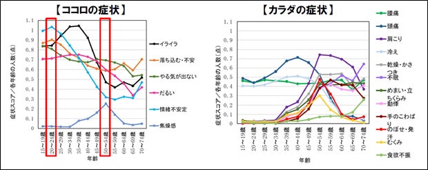 また、「命の母AIお悩み相談」は、更年期ではない若い世代にも利用されています。AIチャットで入力されたお悩みをみると、20代以下でココロの症状にあたる「情緒不安定」「落ち込む・不安」が多く挙がっており、年齢ごとの特徴や症状スコアの変化が明らかになりました。「命の母AIお悩み相談」では、更年期だけではなく、PMSなどの若い世代のお悩みとも向き合っていきます。