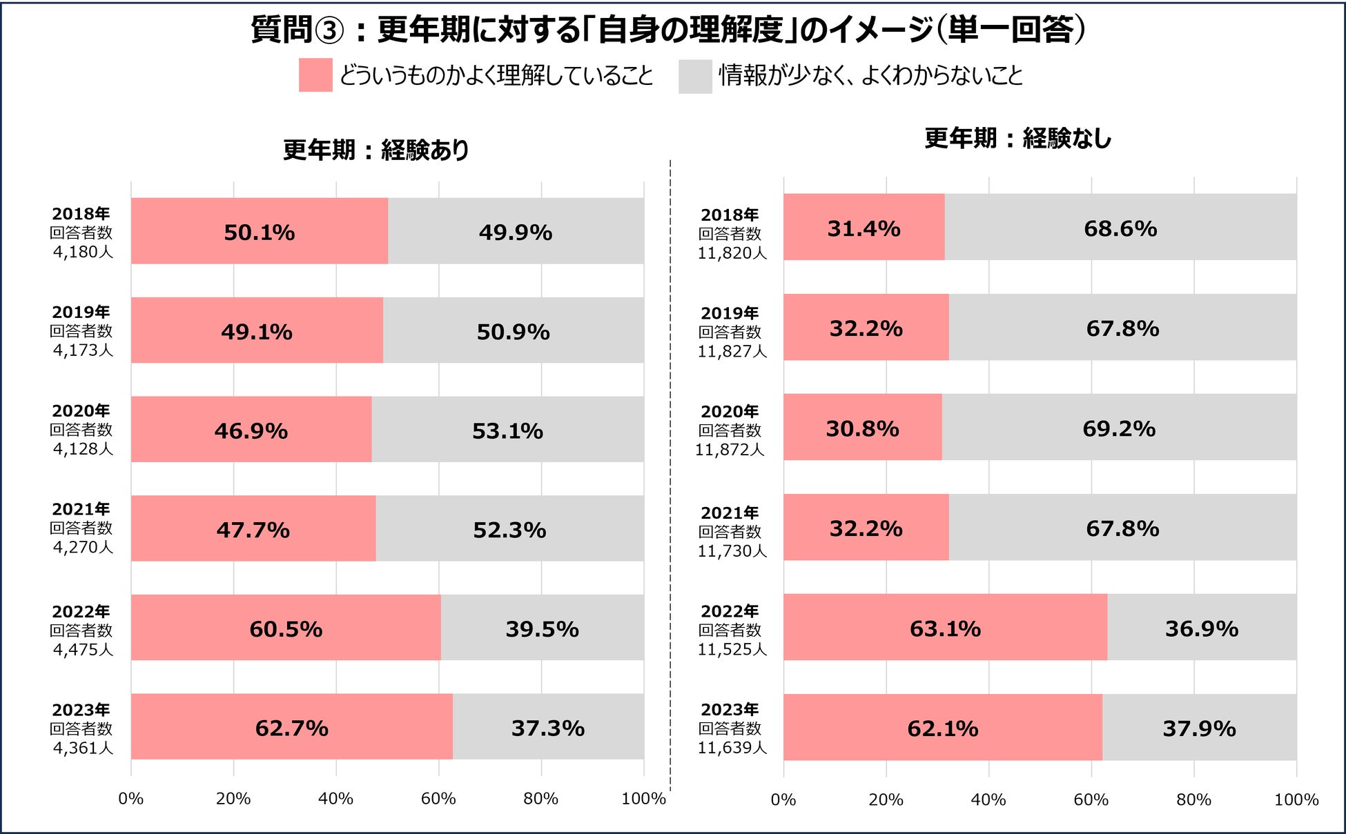 ③更年期への理解度も2022年に急速に進む。経験のない方でも6割以上が「理解している」と回答
