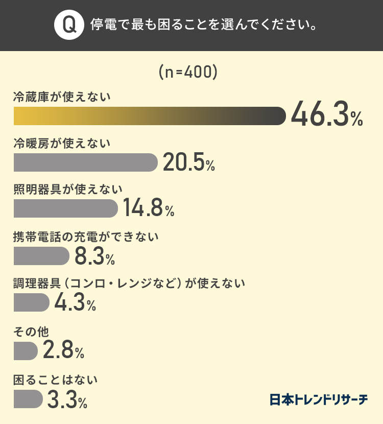 今回は、節電の効果もあり停電は避けられましたが、もし停電になった場合に最も困ることについて聞きました。