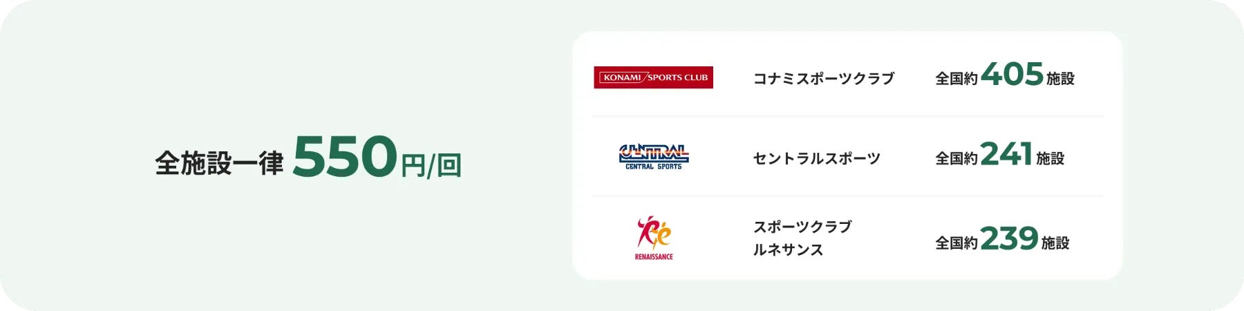 コナミスポーツクラブ(405店舗)、セントラルスポーツ(241店舗)、ルネサンス(239店舗)といった全国885店舗のジムを、1回あたり550円でご利用いただけます。(※店舗数は2025年11月時点。)通常は月額10,000円以上かかる施設を都度格安で利用できるため、「まずは試してみたい」という従業員でも気軽に運動習慣をスタートできます。