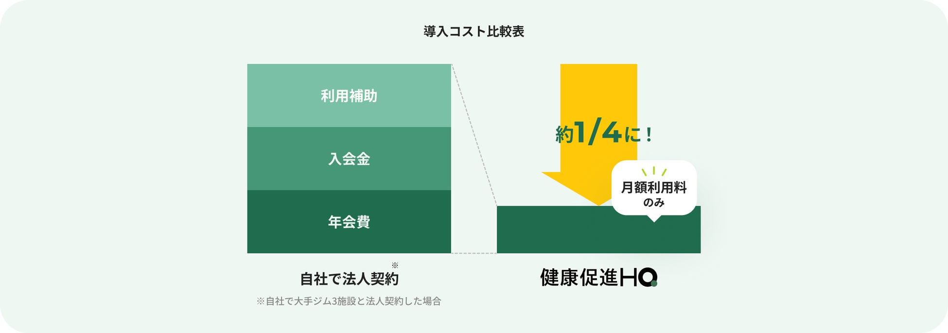 自社で大手ジムと法人契約する場合は、企業として入会金や年会費の支払いが発生しますが、「健康促進HQ」は月額利用料のみでご利用いただけるため、企業のコストを約1/4に削減します。