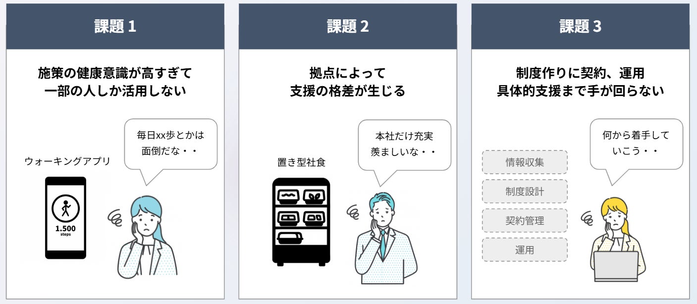 ウォーキングアプリやセミナーなどの施策は、もともと健康意識の高い従業員しか利用せず、本当に支援が必要な層に届きにくいという声が寄せられています。