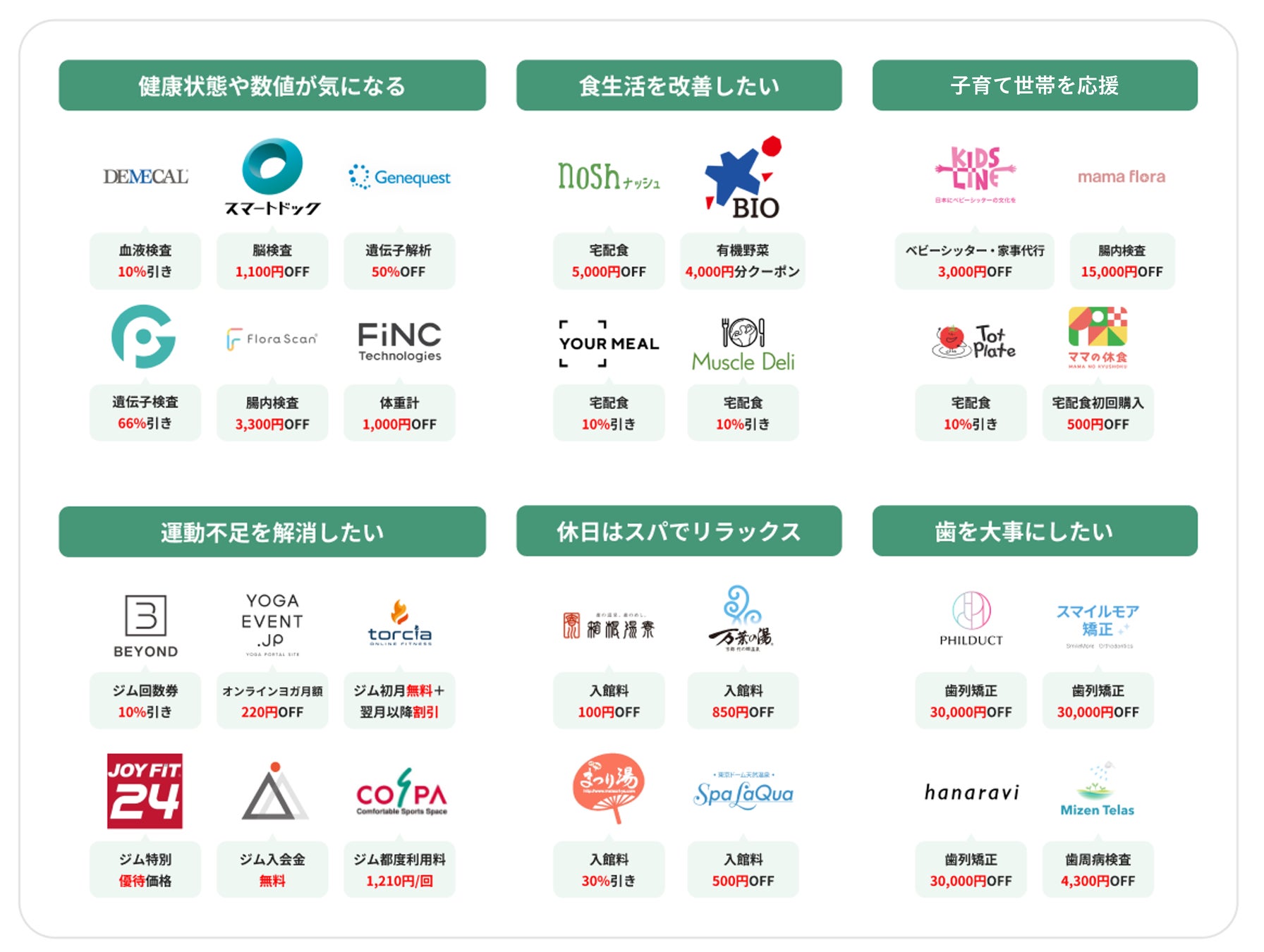 健康診断や人間ドック、宅配健康食など幅広い健康支援クーポンも利用可能。場所や働き方に関わらず、全従業員が自分に最適な健康支援を選べる環境を実現できます。