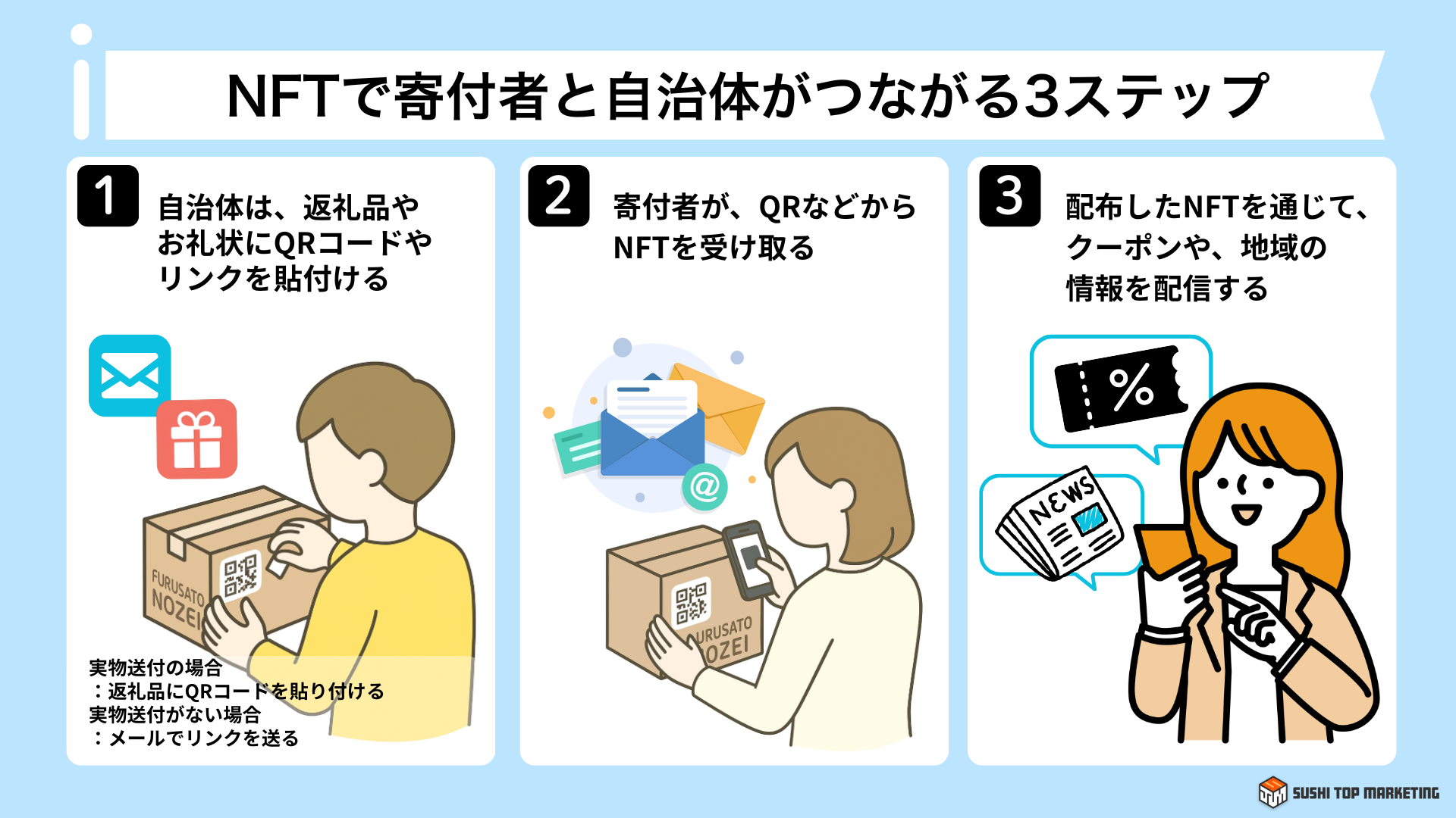 SUSHI TOP MARKETING株式会社(本社:東京都千代田区、代表取締役CEO:徳永 大輔、以下「当社」)では、ふるさと納税や地方自治体の課題に対する自社ソリューション紹介コンテンツ、「【漫画で解説】NFT×ふるさと納税で地域周遊が変わる!自治体DXの最前線」を公開しました。