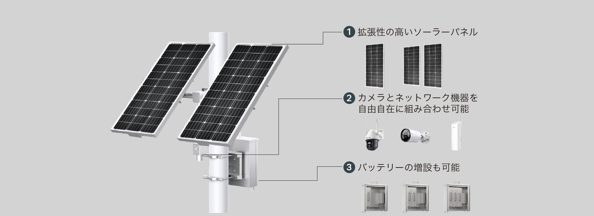 TP-LinkのVIGIソーラー給電システムは、特に過酷な環境での使用を考慮して設計された高効率のソーラー電源システムです。主に屋外でのネットワーク機器や監視カメラに電力を供給するために使用されます。これらのシステムは、強力な90Wまたは60Wのソーラーパネルを搭載し、内蔵バッテリーに蓄電することで安定した電力供給を実現します。これにより、TP-LinkのVIGIソーラーパネルシステムは、特にインフラが整っていない遠隔地や過酷な環境での電力供給に適しています。