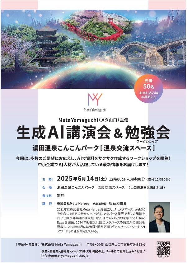 株式会社Meta Heroes(本社所在地:大阪府大阪市、代表取締役:松石和俊、以下「当社」)は、2025年6月14日(土)12:00より、山口市の新たな交流拠点「湯田温泉こんこんパーク」にて開催される生成AI講演会&ワークショップにて、当社代表・松石が登壇することをお知らせいたします。