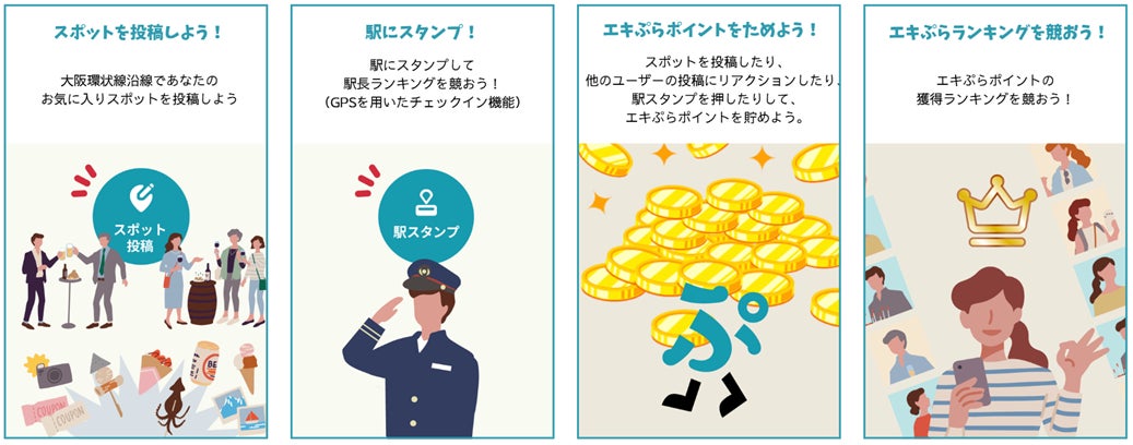 株式会社JR西日本コミュニケーションズ(本社:大阪府大阪市、代表取締役社長:伊藤 義彦)、株式会社JR西日本イノベーションズ(本社:大阪府大阪市、代表取締役社長:門間 洋介)、スマートフォン向けアプリやゲーム開発を手がける株式会社ジェイコンテンツ(本社:京都府長岡京市、代表取締役社長:吉光 隆雅)、一般社団法人関西イノベーションセンター(所在地:大阪府大阪市中央区、理事長:早乙女 実、以下、MUIC Kansai)の4社は、鉄道旅における新たな移動体験の創出を目的に、スマートフォン向けアプリ“鉄道旅専用”SNS「エキぷら」~大阪環状線編~を、2026年3月31日(火)までの期間限定で各アプリストアにて順次配信します。