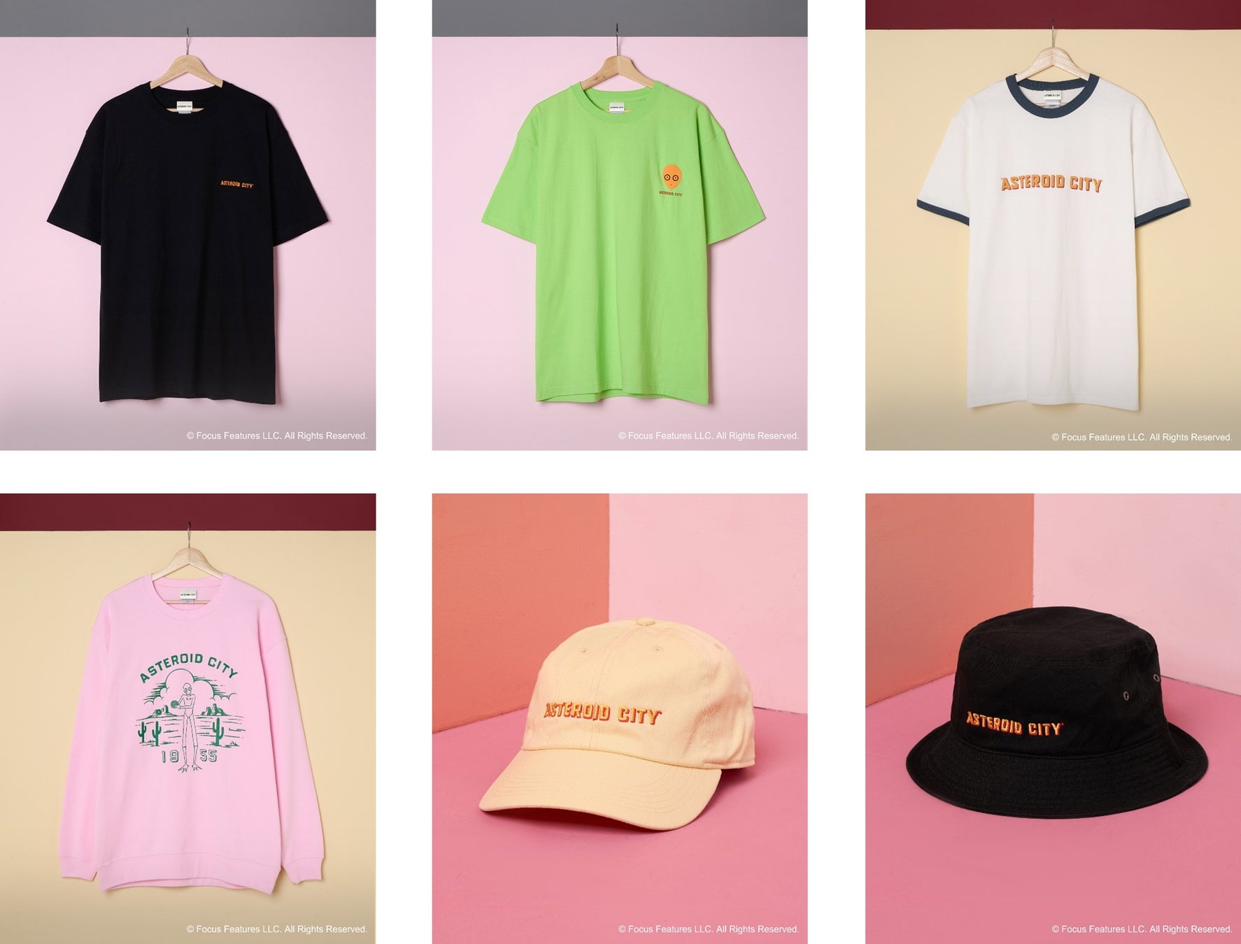 今回販売するのは、映画のロゴを刺繍で施したTシャツやキャップ、作中に登場するエイリアンを発砲プリントし同作をイメージしたカラーで展開するアパレルアイテムなど全6型です。本コラボアイテムは、8月25日(金)~9月4日(月)の期間、渋谷PARCOで開催される展覧会「ウェス・アンダーソン映画公開記念・ “ASTEROID CITY POP UP CAFE &EXHIBITION”」の、EXHIBITION会場内でも販売(※)されます。