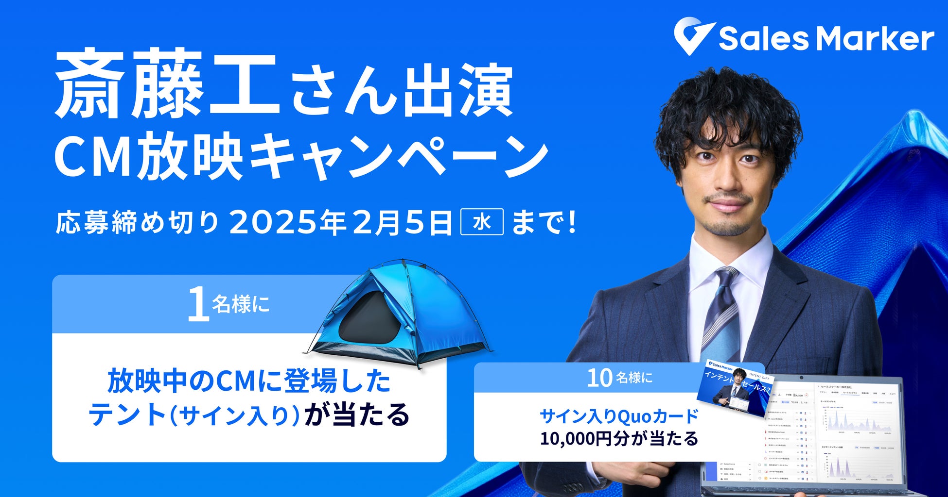 国内初※1「顧客起点」でおこなう新時代の営業手法「インテントセールス」を実現する『Sales Marker(セールスマーカー)』を開発・提供する株式会社Sales Marker(本社:東京都渋谷区、代表取締役 CEO:小笠原 羽恭、以下:当社)は、俳優の斎藤工さんをSales Marker公式アンバサダーに迎え、東京都内でインテントセールスをテーマとしたタクシーCMの放映を開始しました。これを記念し、CMで実際に使用されたテントやQuoカード10,000円分が当たる、Xアカウント限定で特別キャンペーンを実施します。