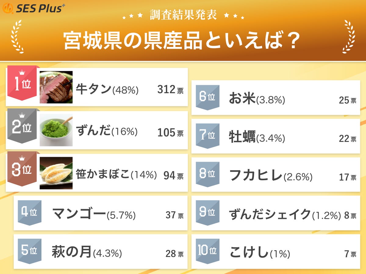 次いで、4位「マンゴー(37票)」、5位「萩の月(28票)」、6位「お米(25票)」、7位「牡蠣(22票)」、8位「フカヒレ(17票)」、9位「ずんだシェイク(8票)」、10位「こけし(7票)」というランキング結果になりました。