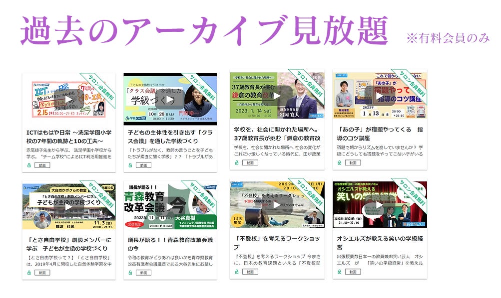 無料会員になると全ての講座に無料で参加することができ、一流教育者の教育哲学、授業実践を学ぶことができます。