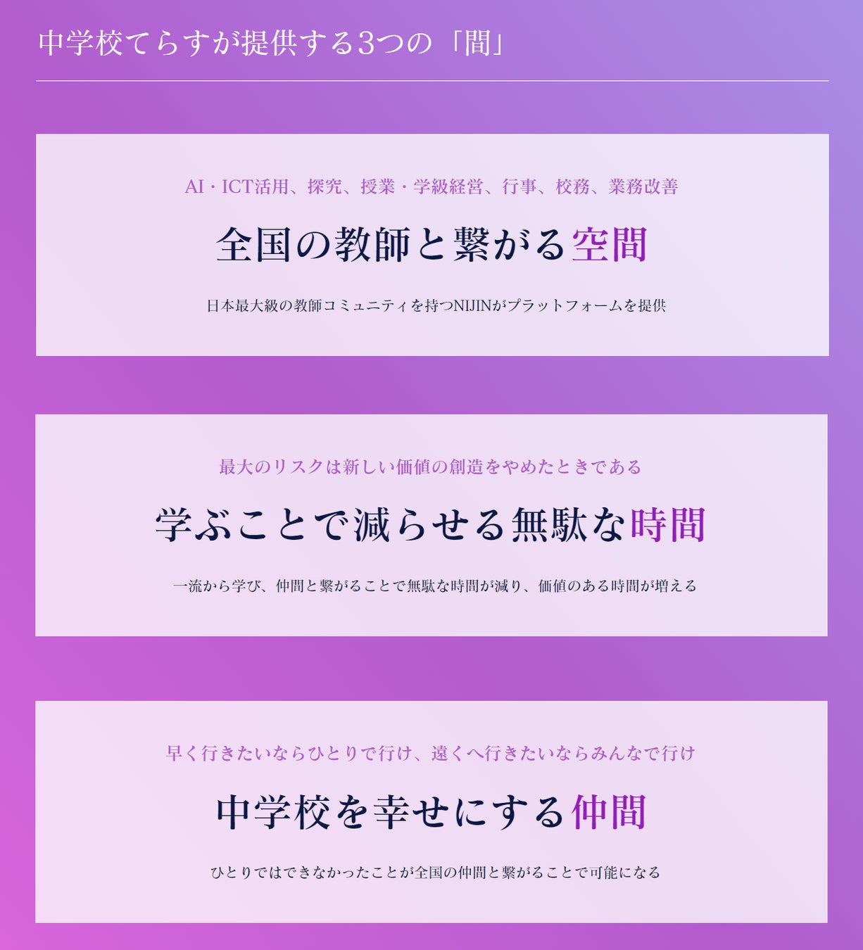 株式会社NIJIN(本社:東京都江東区、代表取締役:星野達郎)は、中学校教師のための会員制サロン「中学校てらす」のホームページが完成したことをお知らせいたします。中学校てらすは『幸せな中学校の在り方』を探求する中学校教師のための会員制サロンであり、一流教育者から学び、全国の中学校教師とつながり、情報交換を行えるコミュニティを提供しています。中学校てらすのホームページは以下のURLからご覧いただけます。