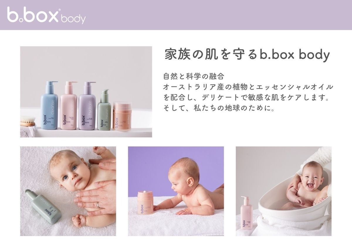 デリケートな肌をやさしくケアし、うるおいを届ける、b.box(ビーボックス)から誕生したベビー&ファミリー向けのボディケアシリーズです。