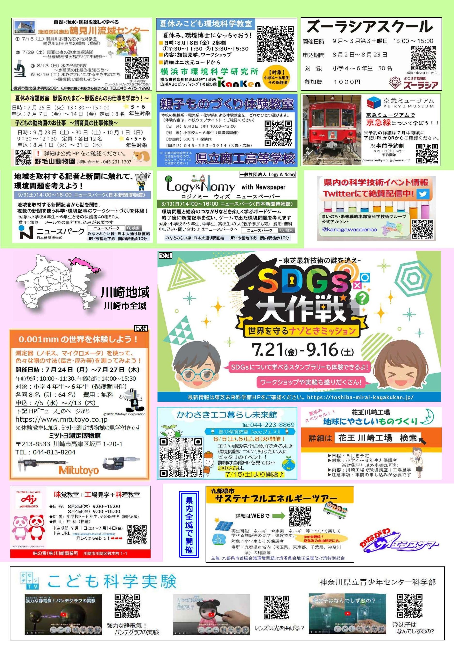 県では、県内の科学館、博物館、大学、企業等の協力を得て、夏休み期間から秋にかけて、県内各地で開催される、小・中学生、高校生を対象にした科学教室や自然体験教室、工場見学会等様々な行事を「かながわサイエンスサマー」として紹介します。