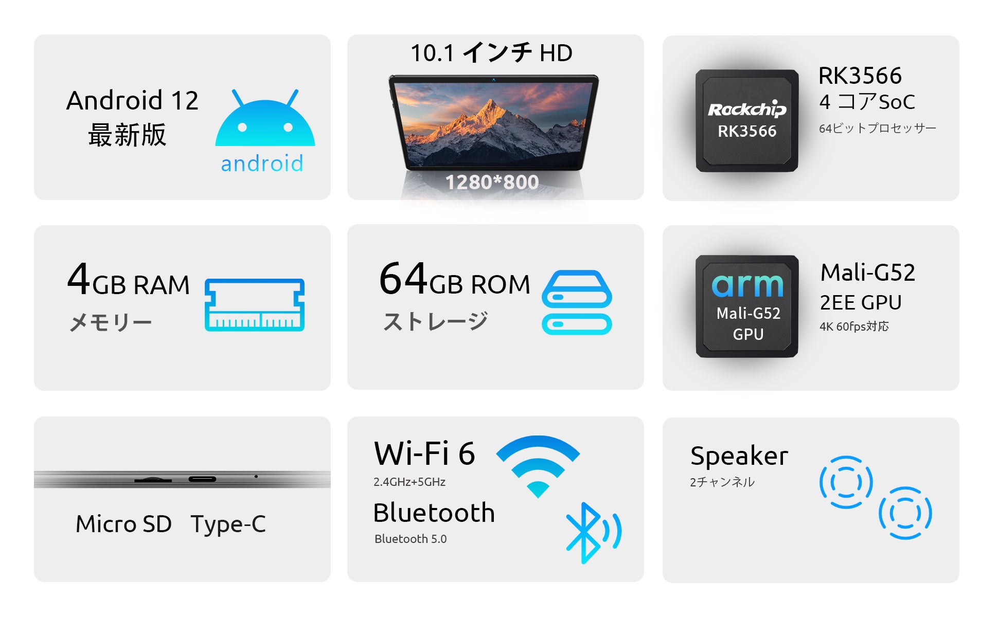タブレットRK3566を搭載しています。4コアCPUは、高性能な「4*A55」搭載し、安定性が高くスムーズな処理を実現し操作がサクサクスピーディーに行えます。Android タブレットWIFI 6モデルは大容量4GBのRAM+64GBのROMで、写真、ビデオ、音楽を保存するのに十分なスペースも備えています。さらに、MicroSDカードを挿入すれば1TB容量を拡張可能です。これにより、高いパフォーマンスと高い電力効率を両立させています。