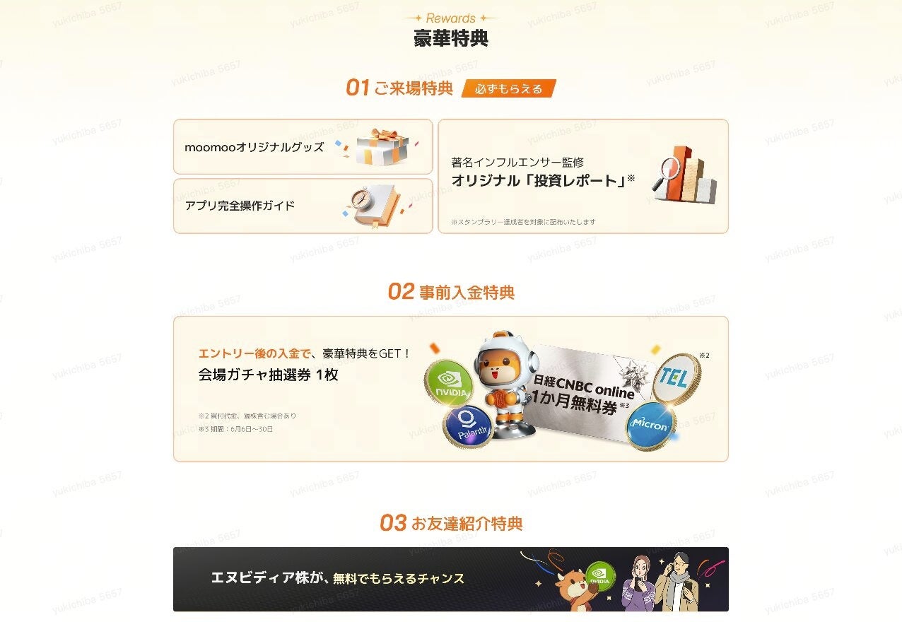 イベント来場登録を完了すると、以下の豪華特典がもらえるキャンペーンにご応募いただけます。入金やお友達紹介で、さらに特典をゲットしましょう!