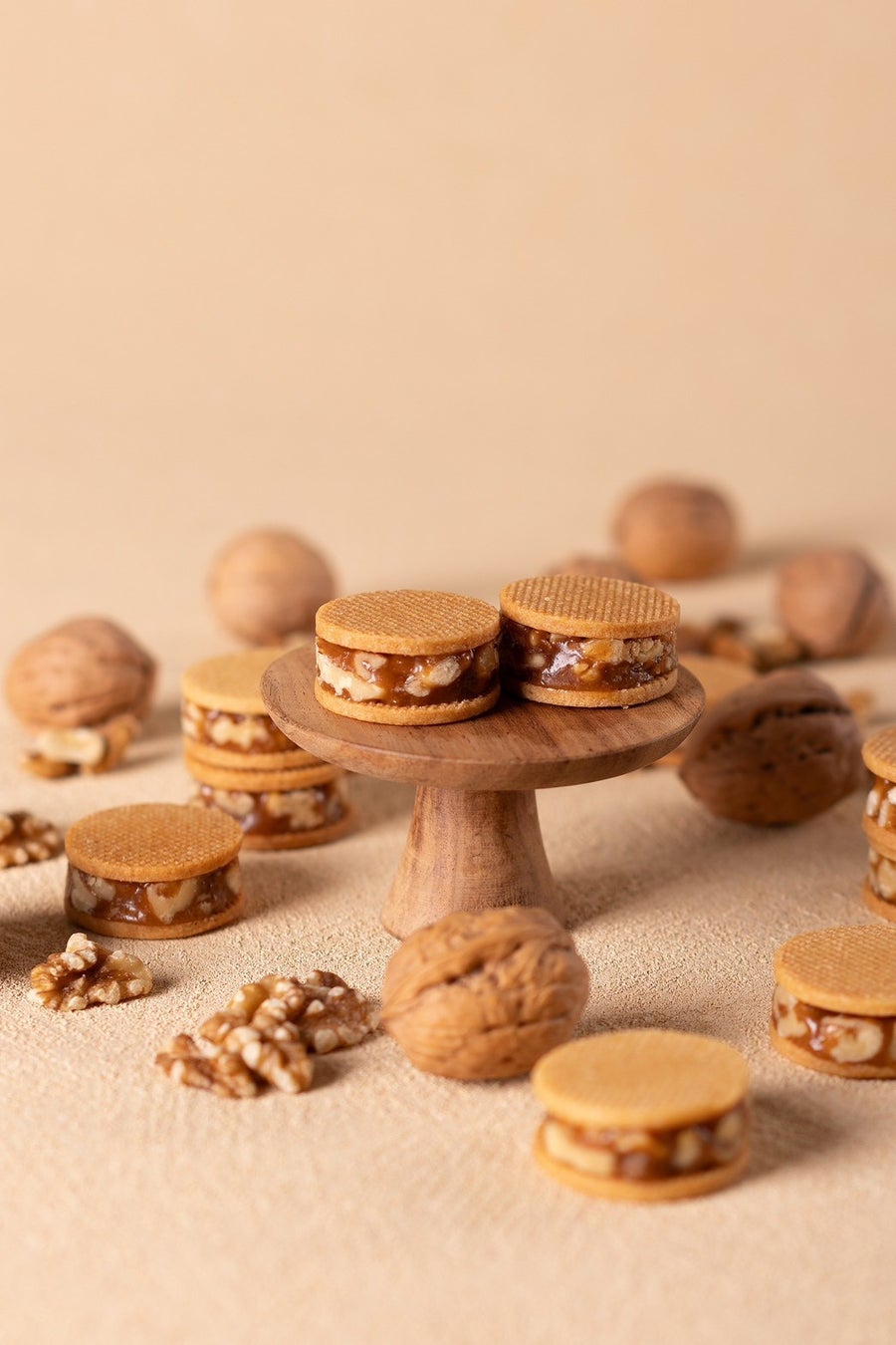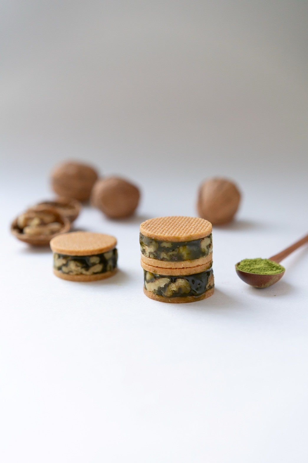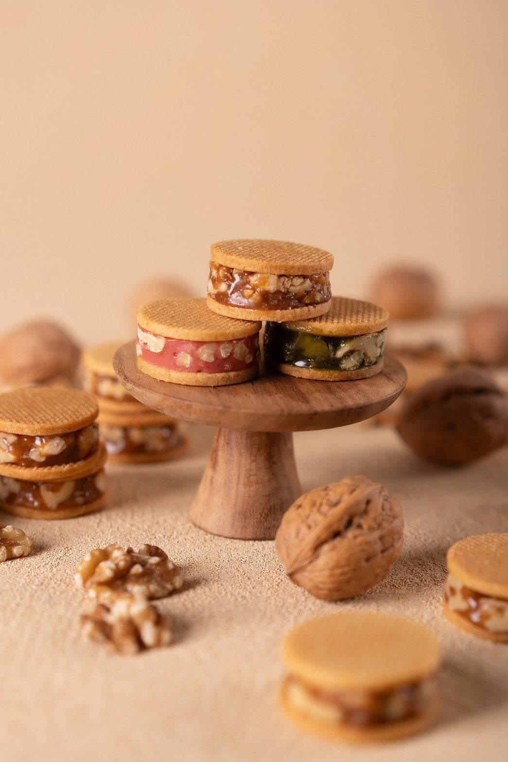 キャラメルヌガーは、渋みの少ないくるみを香ばしくローストし、驚くほどやわらかな口どけに。米粉をブレンドしたサクサクのクッキー生地で包み込み、石川県・珠洲の塩でまろやかさと味の奥行きをプラス。パティシエの熟練の技で、3種類のフレーバーに合わせてキャラメルの焦がし加減を丁寧に調整しています。