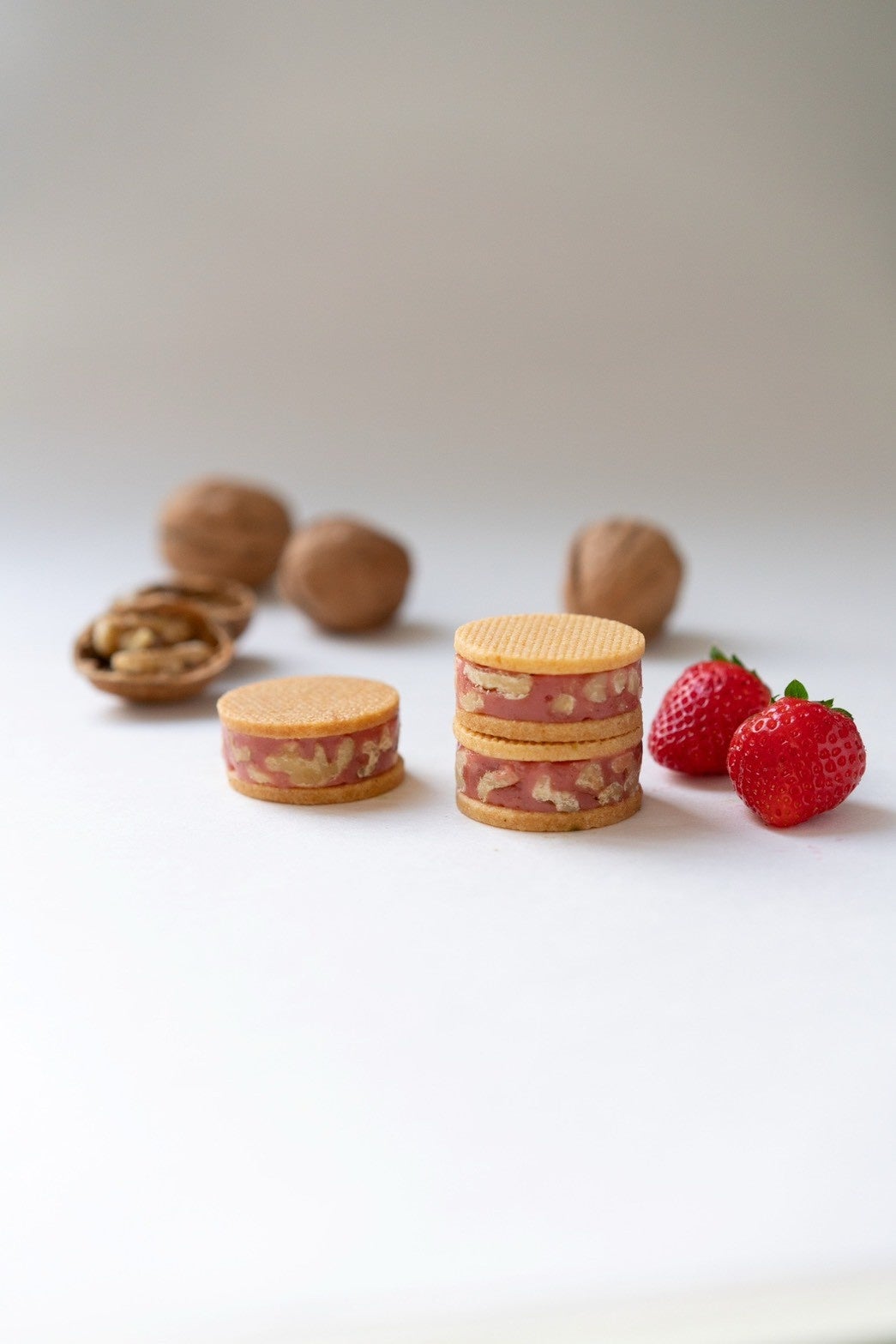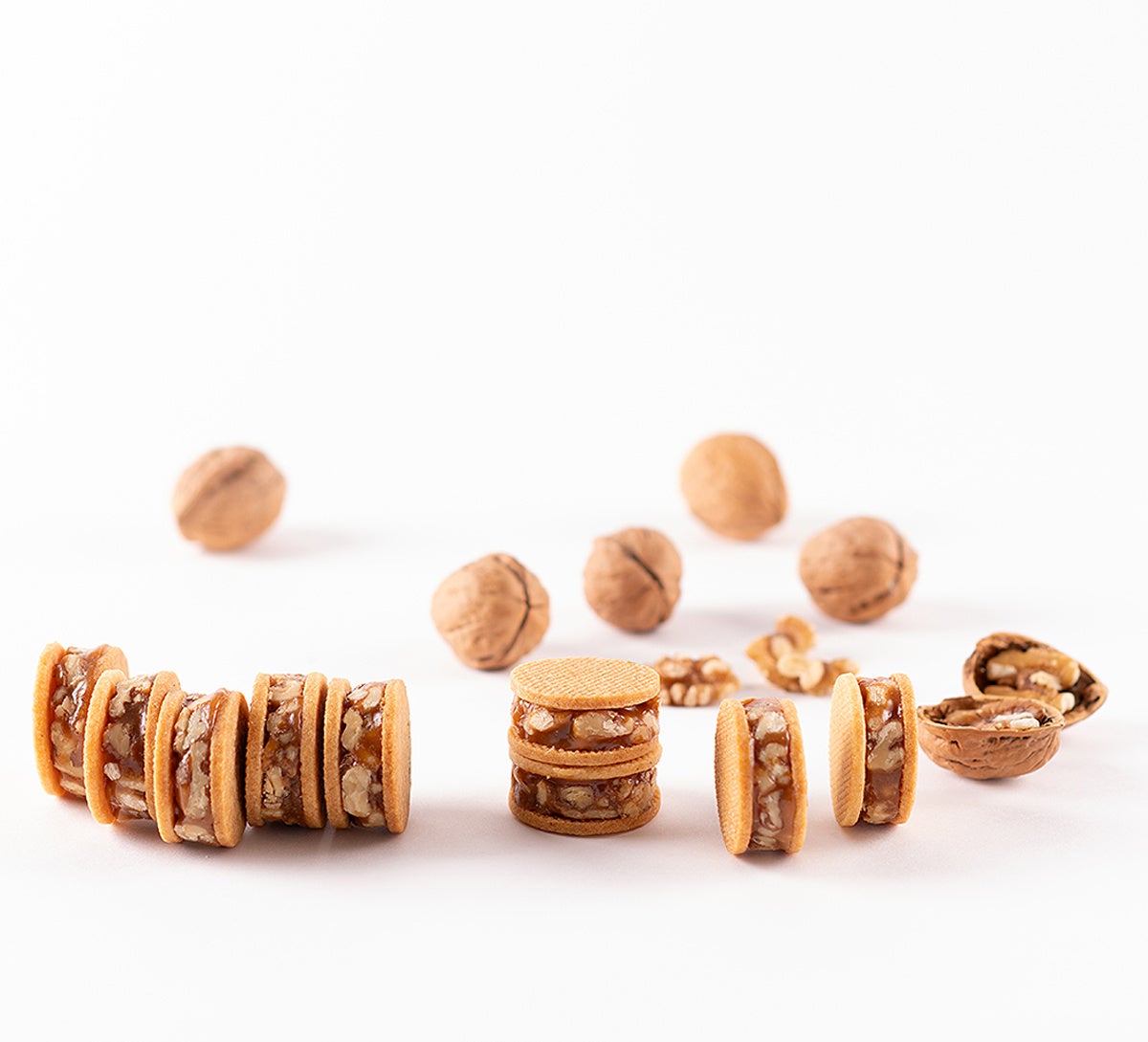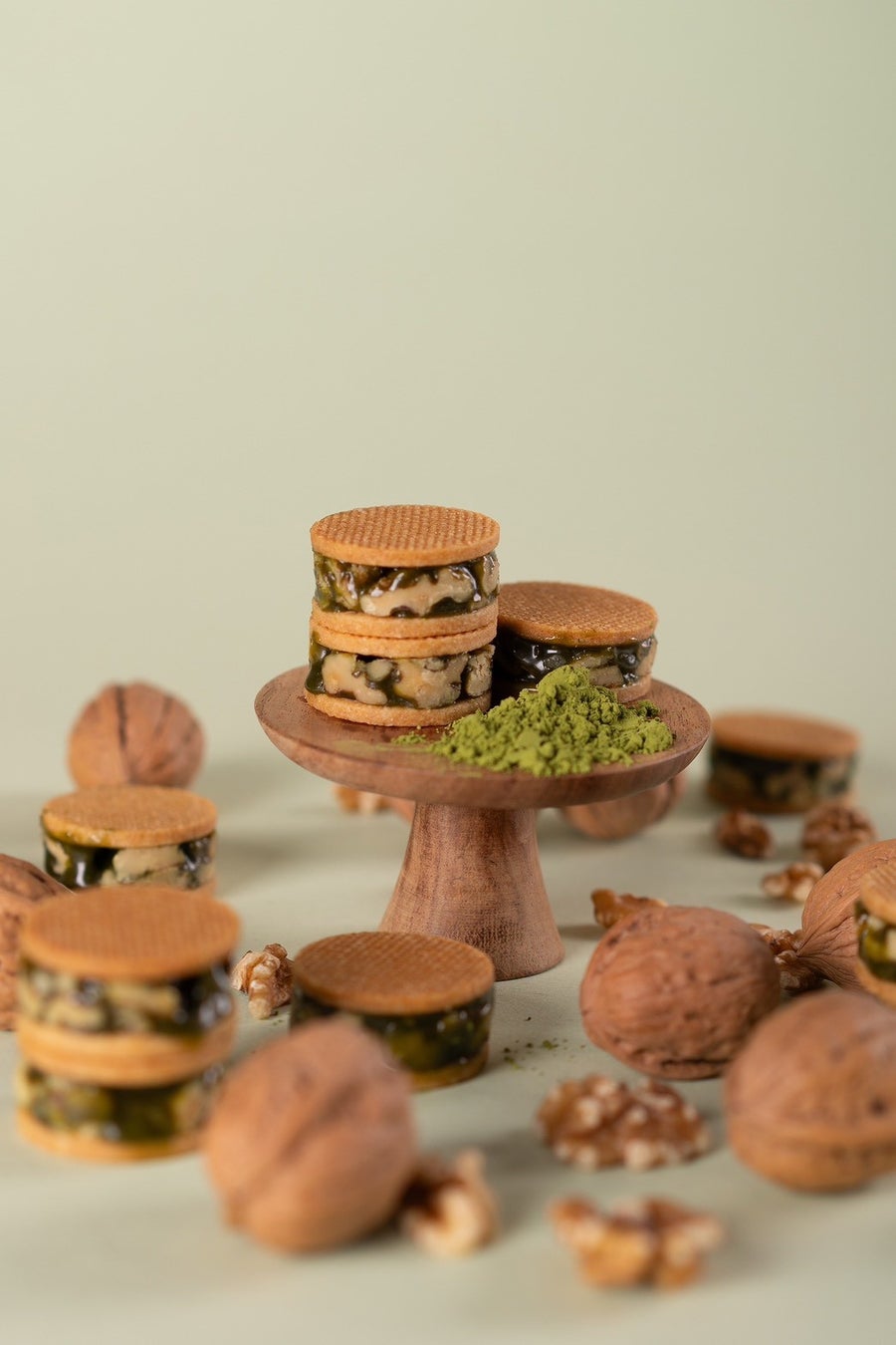 キャラメルヌガーは、渋みの少ないくるみを香ばしくローストし、驚くほどやわらかな口どけに。米粉をブレンドしたサクサクのクッキー生地で包み込み、石川県・珠洲の塩でまろやかさと味の奥行きをプラス。パティシエの熟練の技で、3種類のフレーバーに合わせてキャラメルの焦がし加減を丁寧に調整しています。