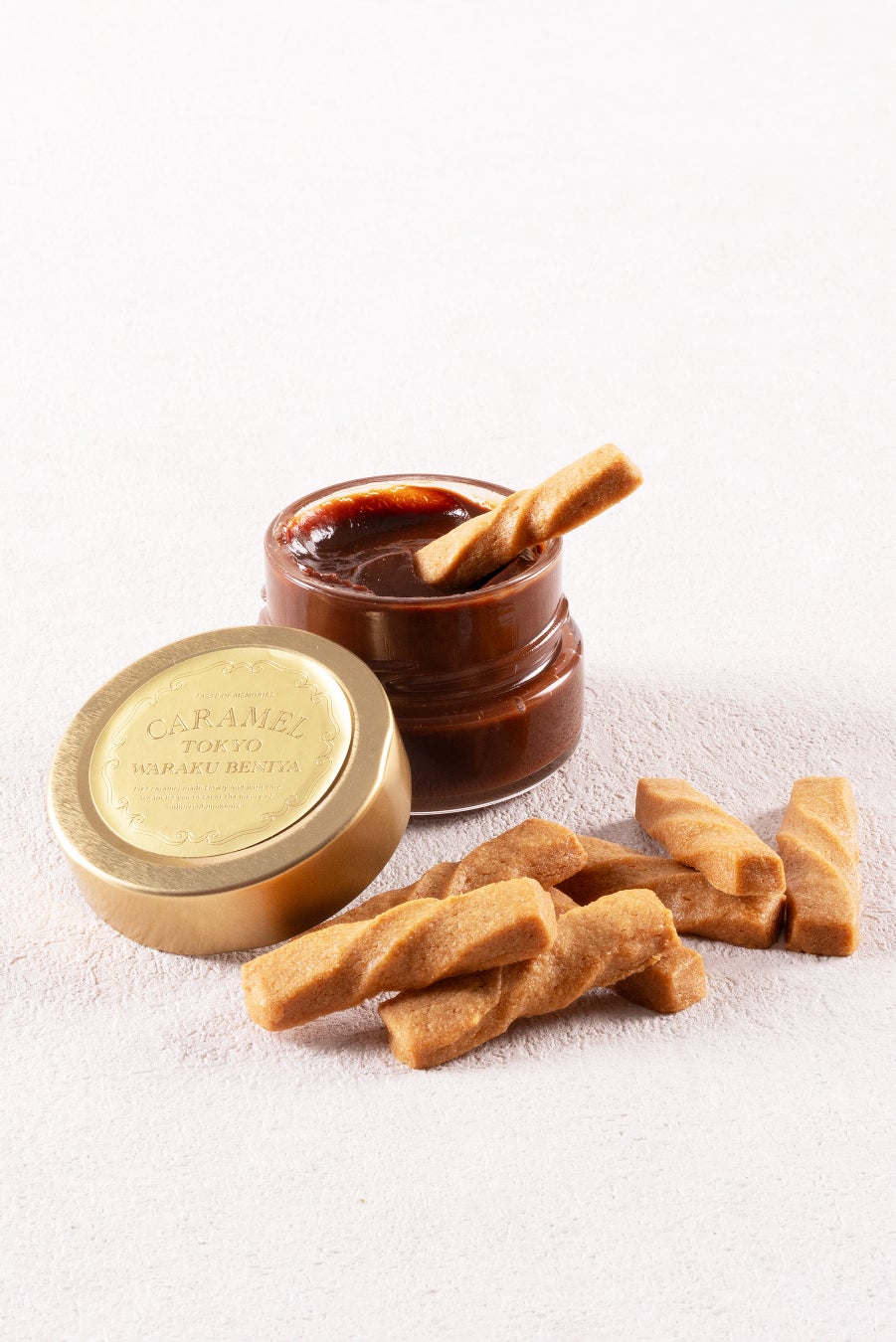 本和香糖と黒糖を使い、しっかりとした歯ごたえとコクのある甘さに仕上げたねじりサブレとキャラメルペーストのセット。ディップして楽しむことで、素材の豊かな味わいが広がります。