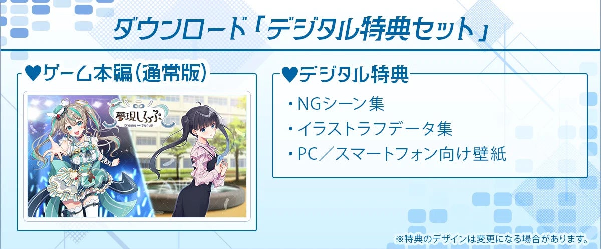 「デジタル特典セット」版には、ゲーム本編に加え、ボイス収録時のNGシーン集やPC・スマートフォン向けの壁紙など、ここでしか視聴、閲覧できない特別なデータが含まれています。