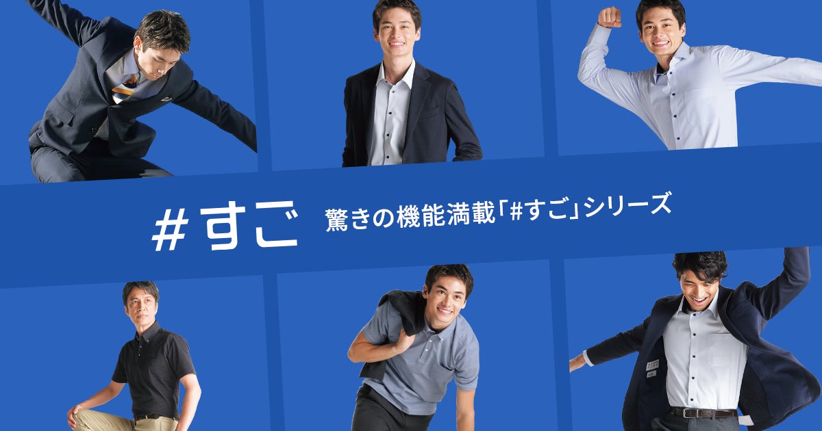 社商品の機能性の高さを訴求する「#すご」シリーズ。ジャケットやスラックス、ポロシャツなどの各アイテムにお客様からの要望が多い機能を備え、着心地やコスパの高さを打ち出した商品シリーズです。