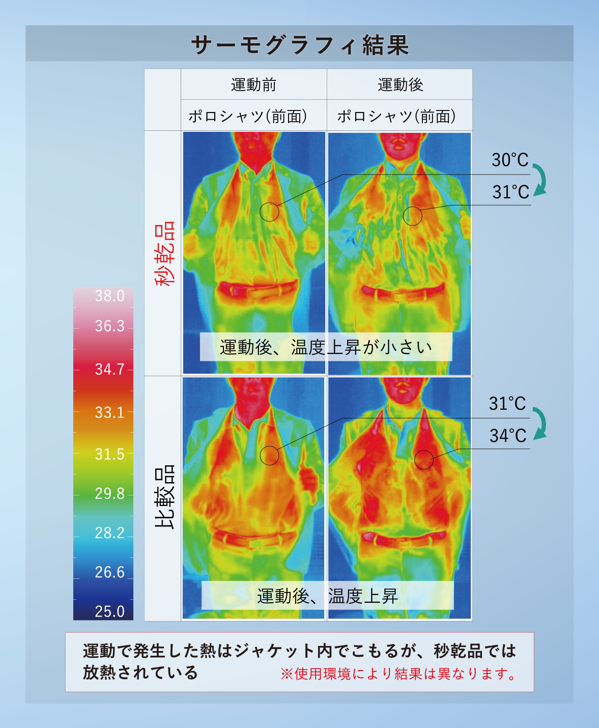 秒乾®ジャケットと当社で扱っている一般的なジャケットを着用した状態で、下記2つを検証。
